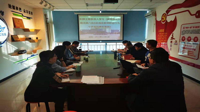 为进一步落实学院《关于切实做好师德失范违纪情况以案促改工作的方案》,依据《内蒙古机电职业技术学院车辆工程系关于深入开展学术规范建设与学术道德教育的实施方案》,2021年12月1日16:30组织全体教师学习《教育部公开曝光第八批8起违反教师职业行为十项准则典型案例》,此次学习会由车辆工程系党总支书记、主任吴政主持,车辆工程系全体教师参会。