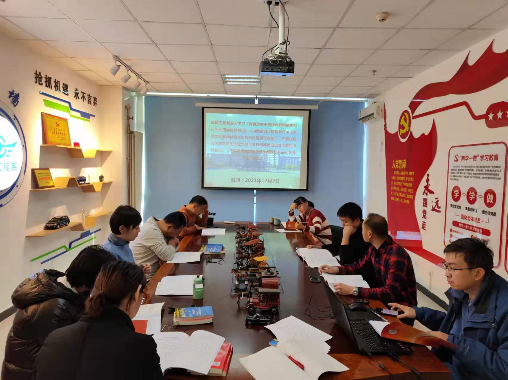 为进一步落实学院《关于切实做好师德失范违纪情况以案促改工作的方案》,依据《内蒙古机电职业技术学院车辆工程系关于深入开展学术规范建设与学术道德教育的实施方案》,2021年12月2日16:00车辆工程系组织全体教师深入学习师德师风相关文件,文件包括:《教育部关于高校教师师德失范行为处理的指导意见》《内蒙古自治区教育厅关于高等学校教师师德失范行为处理意见》《内蒙古自治区教育厅关于建立健全高校师德建设长效机制的指导意见》《严禁教师违规收受学生及家长礼金等行为的规定》,此次学习会由车辆工程系党总支书记、主任吴政主持,车辆工程系全体教师参会。