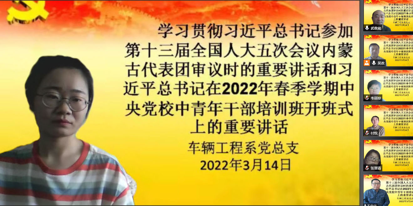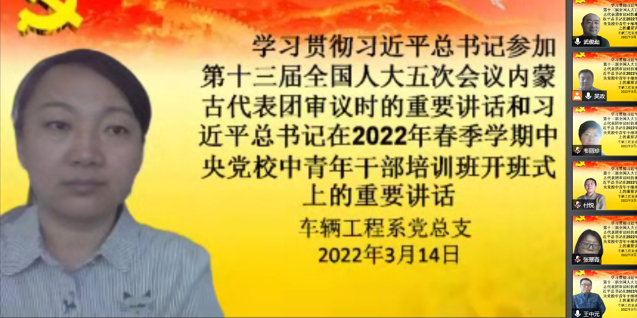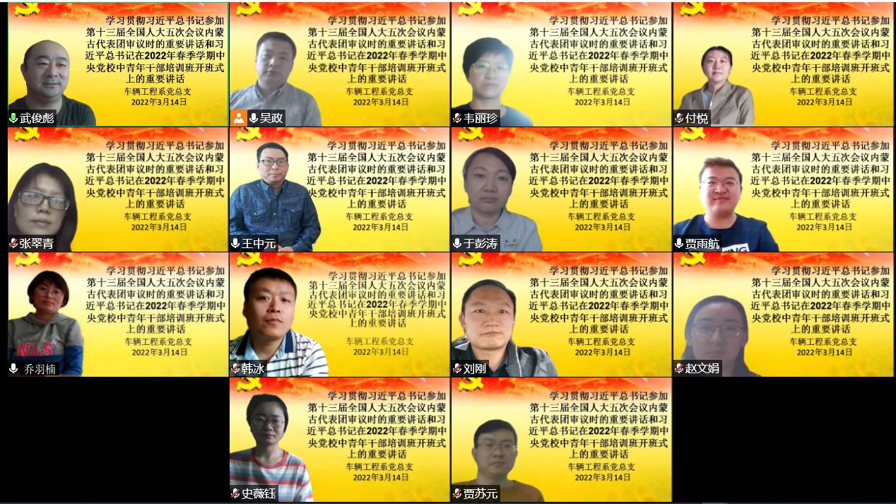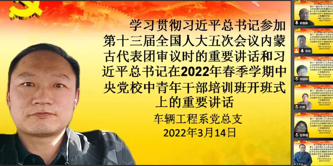 根据自治区党委、自治区教育厅及学院党委工作部署要求,车辆工程系党总支于2022年3月14日14:40分召开“习近平总书记参加第十三届全国人大五次会议内蒙古代表团审议时的重要讲话”和“习近平在2022年春季学期中央党校中青年干部培训班开班式上的重要讲话”线上专题学习会。车辆工程系党总支书记、主任吴政主持此次会议,车辆工程系全体教职工党员线上参加了此次专题学习会。