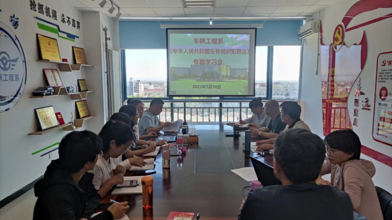 为扎实开展《中华人民共和国反有组织犯罪法》学习贯彻工作,根据学院宣传部《内蒙古机电职业技术学院关于深入开展学习< 中华人民共和国反有组织犯罪法>的通知》,车辆工程系党总支于5月30日召开专题学习会,车辆工程系党总支书记、主任吴政领学,车辆工程系全体教师参加学习会。