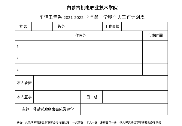 通过制定个人2021年下半年工作计划,切实提升了车辆工程系每位教职工对自身岗位职责及工作内容的深入认知。希望车辆工程系全体教职工对标对表,从全局出发,全大局考虑,认真履行个人岗位职责,为车辆工程系的发展作出积极的贡献,为学院更好更快的发展作出卓越的贡献。