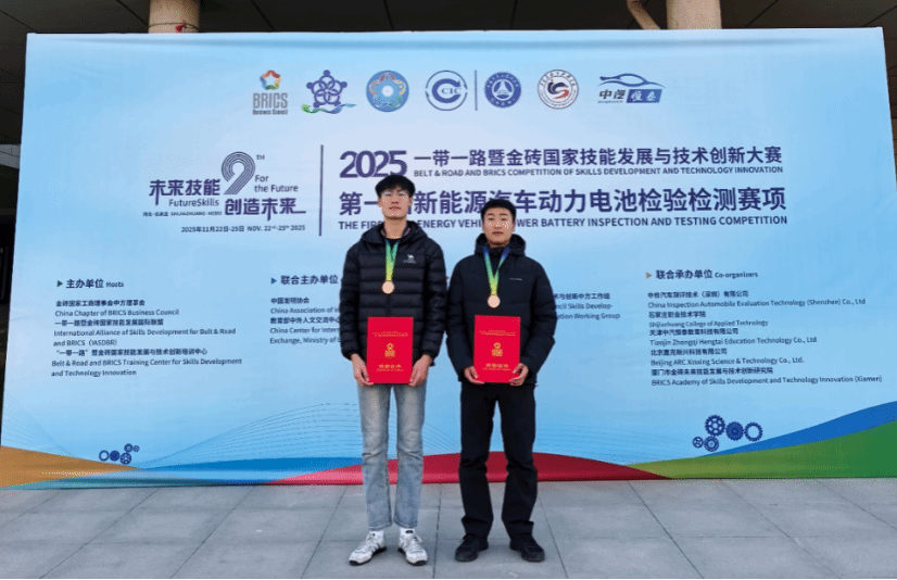 11月22-26日,2025年“一带一路暨金砖国家技能发展与技术创新大赛之新能源汽车动力电池检验检测赛项”全国总决赛在石家庄职业技术学院圆满落幕。车辆工程系选派的学生团队——史硕凯、田浩珺两位同学,凭借扎实的专业技能、稳定的现场发挥和出色的团队协作,在激烈的竞争中荣获全国三等奖,展现了我校在新能源汽车领域的教学实力与人才培养成果。