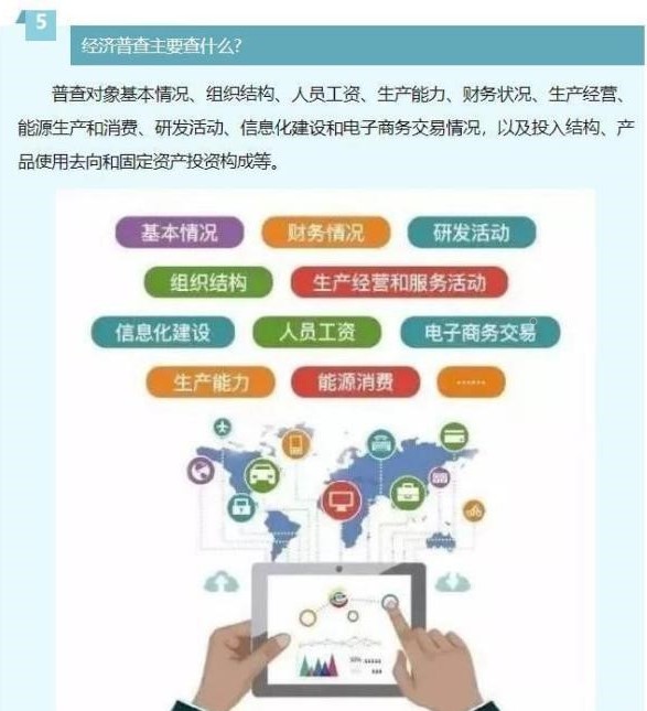 经济普查主要对普查对象的基本情况、组织结构、人员工资、生产能力、财务状况、生产经营、能源生产和消费、研发活动、信息化建设和电子商务交易情况,以及投入结构、产品使用去向和固定资产投资构成等进行调查,旨在全面了解国家或地区的经济状况和发展趋势,为政府决策、产业规划以及经济发展提供准确的数据支持。