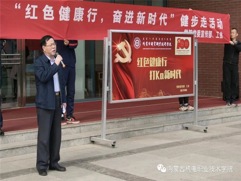启动仪式上,学院党委委员、副院长、党史学习教育领导小组副组长郝俊致辞指出,今年是中国共产党成立一百周年,是全院师生政治生活中的一件大事。此次健步走活动是一堂“行走”的党史学习教育大课,学院将庆祝建党百年的系列实践活动,融汇于全年党史学习教育中,融入日常,抓在经常,贯穿始终。借此之际,希望广大教职员工用“满腔热情和矫健步伐”开展好此次党史学习教育实践活动,发扬红色传统,传承红色基因。通过这种融“党史学习、低碳环保、强健体魄”等元素的健步走活动,传承百年奋斗精神,感悟践行初心使命,赓续共产党人精神血脉,展现机电人奋勇争先、昂扬向上的精神风貌。随后,郝俊副院长宣布“红色健康行,奋进新时代”健步走活动正式启动。
