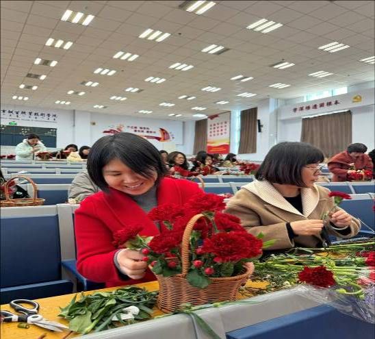 插花活动现场,女教职工们在插花老师的讲解和指导下,一边发挥自己的想象力,一边互相交流创意,在温馨愉悦的气氛中,一蓝蓝错落有致、浪漫优雅,凝聚着女教职工智慧和巧思的插花作品呈现出来,花香弥漫中,女职工们笑容灿烂,展现了新时代女性的自信与风采。