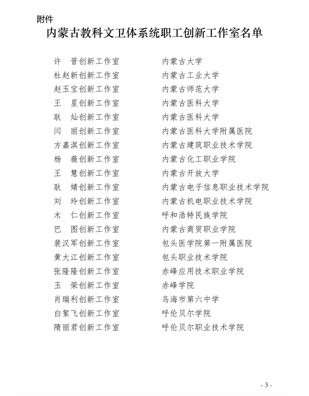 2024年12月18日,内蒙古自治区教科文卫体工会自治区总工会下发《关于内蒙古自治区教科文卫体系统 2024 年职工创新工作室创建情况的通报》(内教科文卫体工发〔2024〕41号),我院“刘玲创新工作室”被评为“2024年内蒙古教科文卫体系统职工创新工作室”。