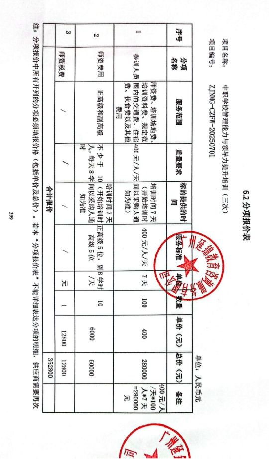 1 | 中职学校管理能力与领导力提升培训 | 培训时间7天(开始培训时间以采购人通知为准) | 符合国家及行业验收标准并达到采购人要求 | 352800.00 |