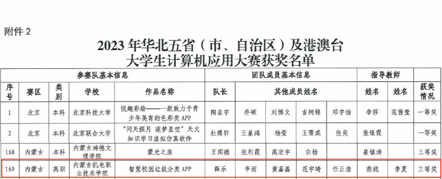 近日,2023年华北五省(市、自治区)及港澳台大学生计算机应用大赛获奖名单揭晓,我院信息工程系作品《智慧校园垃圾分类APP》(学生:薛乐、辛雨、黄嘉磊、范宇琦、任正浩,指导教师:燕妮 李夏)荣获全国总决赛三等奖。