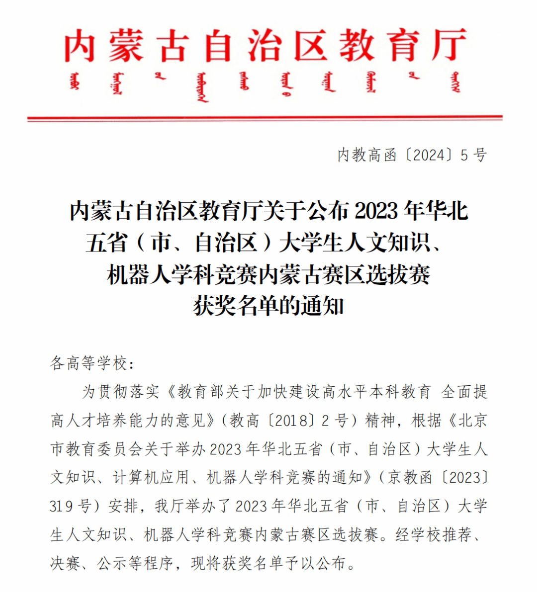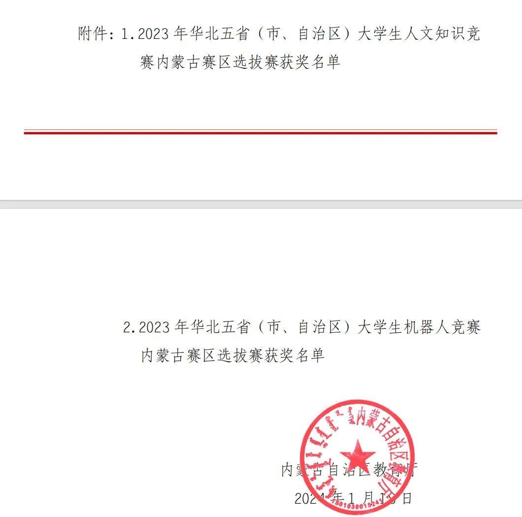 此外,2023年华北五省(市、自治区)大学生机器人学科竞赛内蒙古赛区选拔赛获奖名单也于近日公布,我院3支参赛团队分别荣获“强国赛道( 无人机任务赛)”二等奖1项、“人工智能与机器人创意设计赛”三等奖2项。