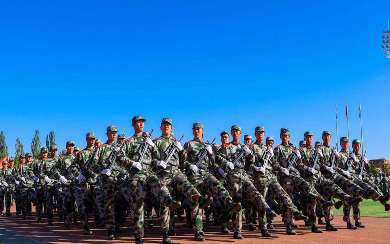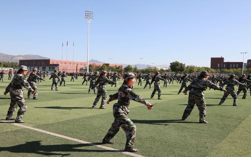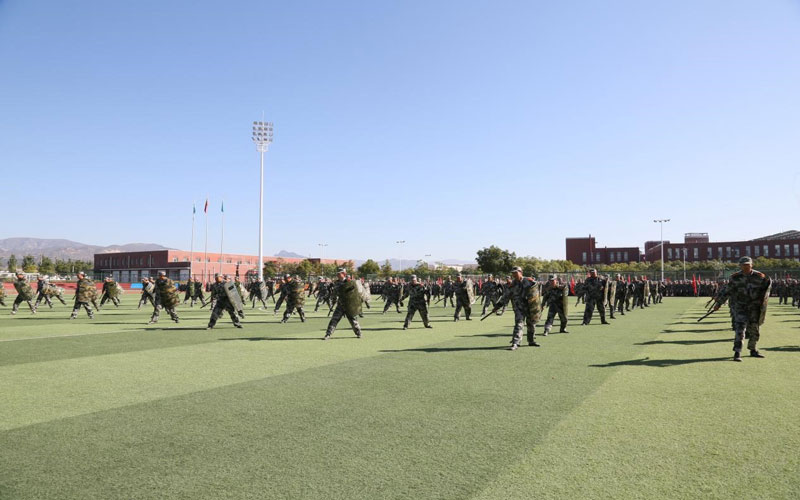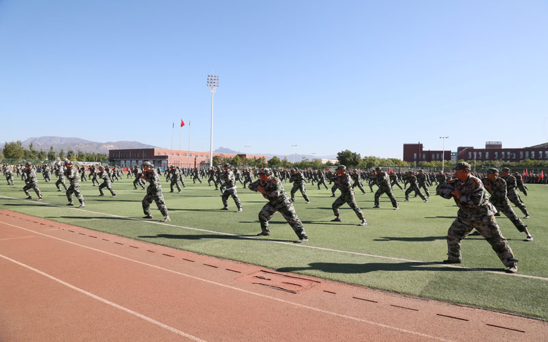 随着教官一声令下,2023级新生军训团排着整齐列队、踏着有力步伐、喊着嘹亮口号,精神饱满、斗志昂扬入场接受检阅,并依次进行军体拳、匕首操、警棍盾牌操的激情演示。