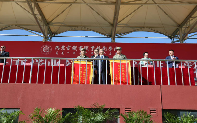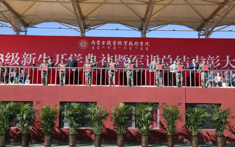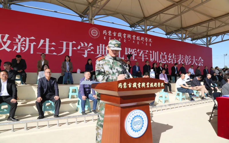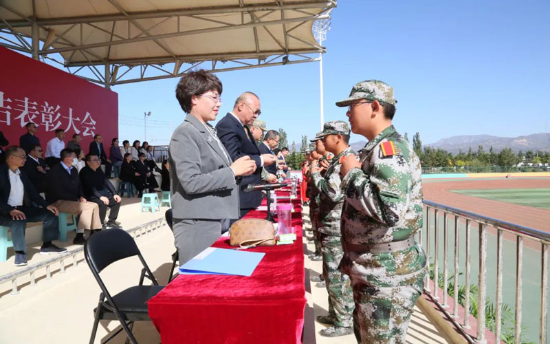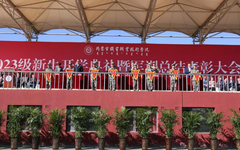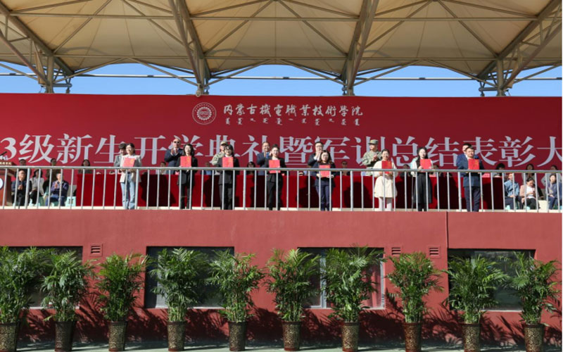 高军宣读了《内蒙古机电职业技术学院2023级新生军训工作先进集体、先进个人的表彰决定》。帮训部队和学院领导分别为本次军训中荣获先进集体和个人的师生代表、优秀教官代表颁奖。