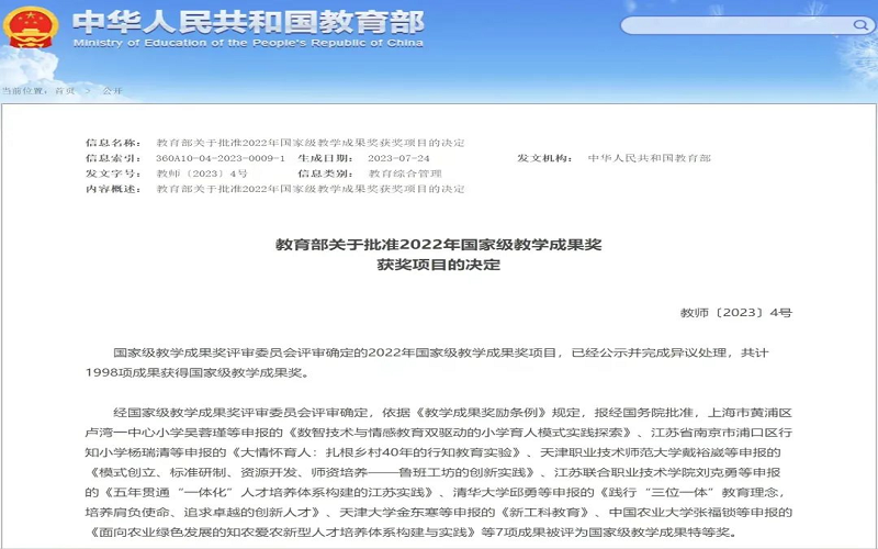 据悉,本次国家级教学成果奖评审委员会评审确定的2022年国家级教学成果奖项目,共计1998项成果获得国家级教学成果奖。国家级教学成果奖分基础教育、职业教育、高等教育、研究生教育四类,是国家教育教学改革领域综合性、最高级别的奖励,每四年评审一次,是加快建设教育强国、落实立德树人根本任务的重要举措,是对学校人才培养工作和教育教学改革成果的检阅和展示。