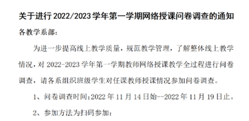为了能够准确掌握线上教学整体情况,学院向各教学系部公布了邮箱,收集倾听不同声音,教务处面向全体学生对授课教师开展线上评教调查问卷工作,全方位、多角度确保线上教学质量。