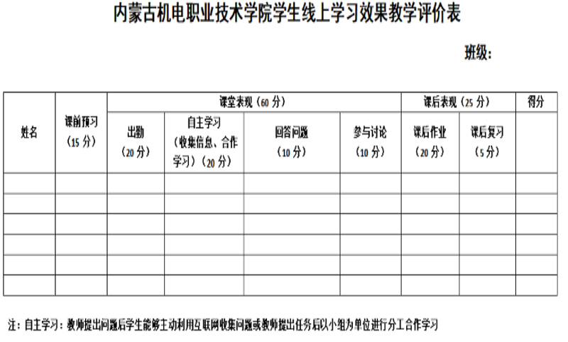 为规范教学,教务处先后印发了《内蒙古机电职业技术学院学生线上学习效果教学评价表》和《内蒙古机电职业技术学院教师线上教学评价表》。教务处、质量监控与评估处和各教学系部线上根据《评价表》指标体系巡查听课,确保教学质量。