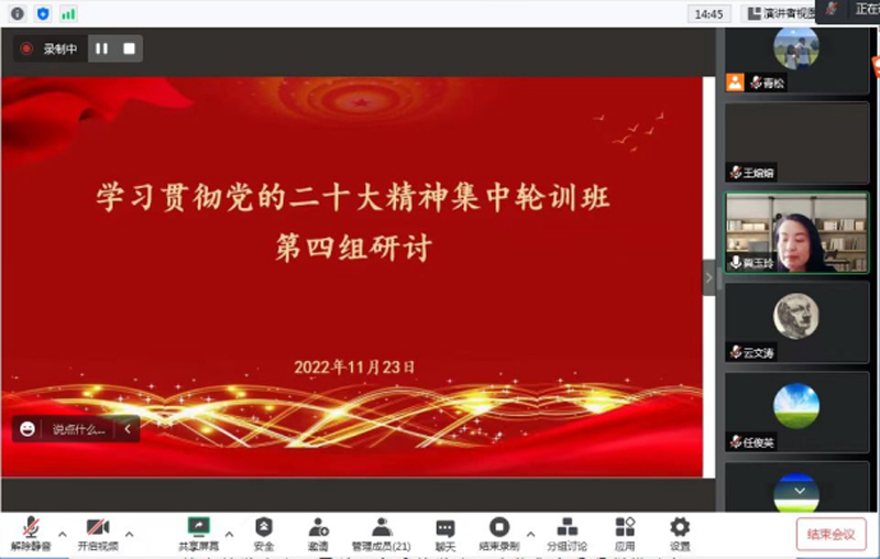 为更加全面、准确、深入地学习领会党的二十大的内涵要义和精神实质,统一思想、凝聚共识,激励广大党员干部在新时代新征程上敢于担当、积极作为,提振精气神,展现新作为。11月23日下午-11月25日下午,按照学院党委统一安排,各学习小组开展学习贯彻党的二十大精神专题交流研讨会,全体参训学员在小组研讨会上进行交流发言。
