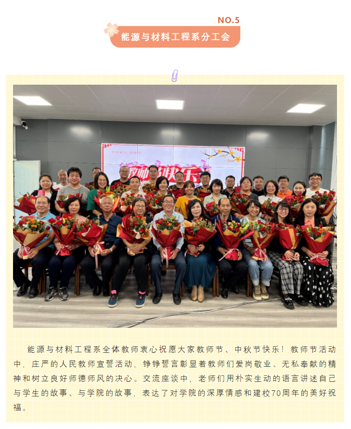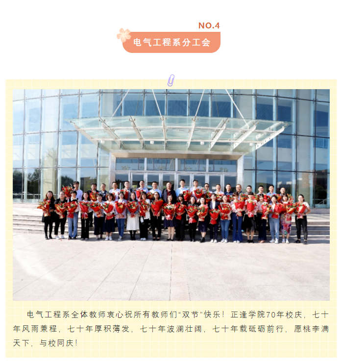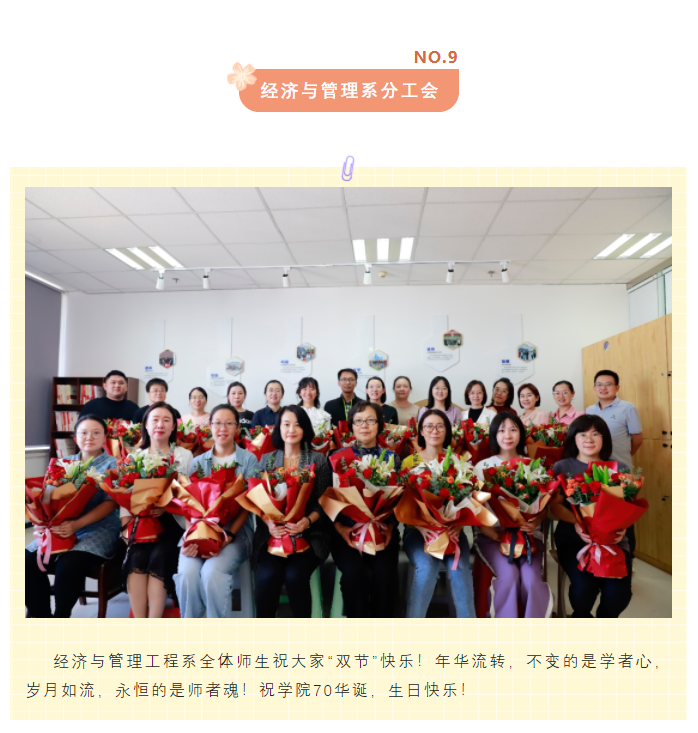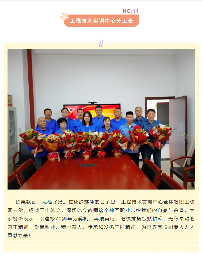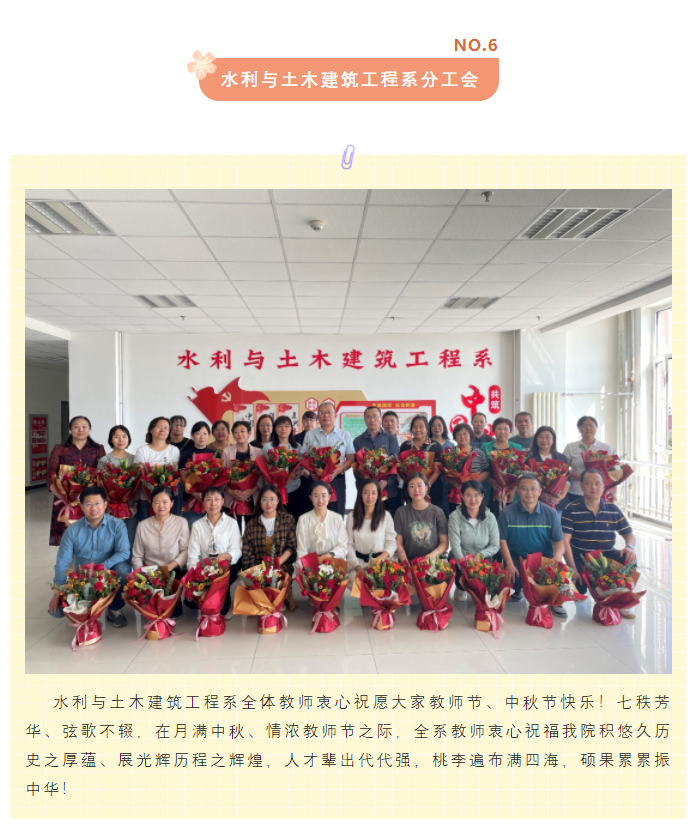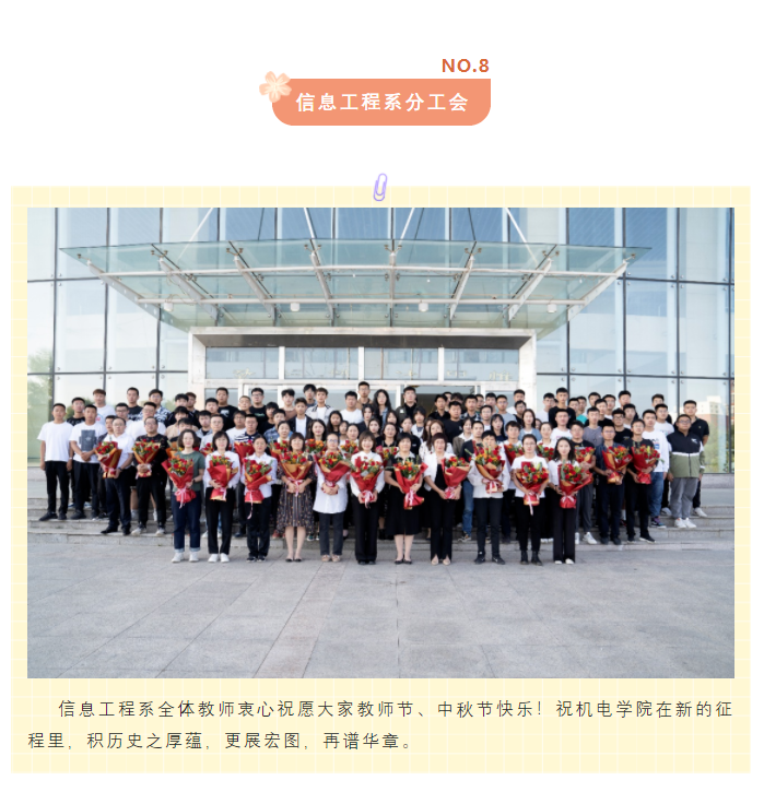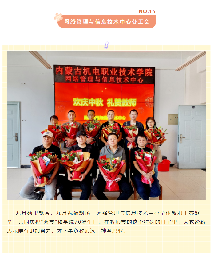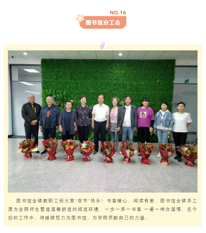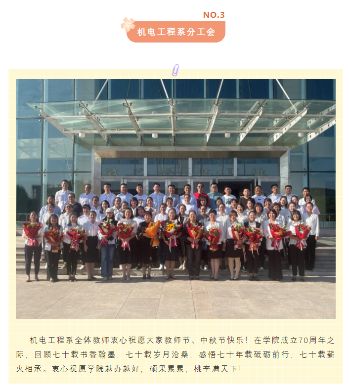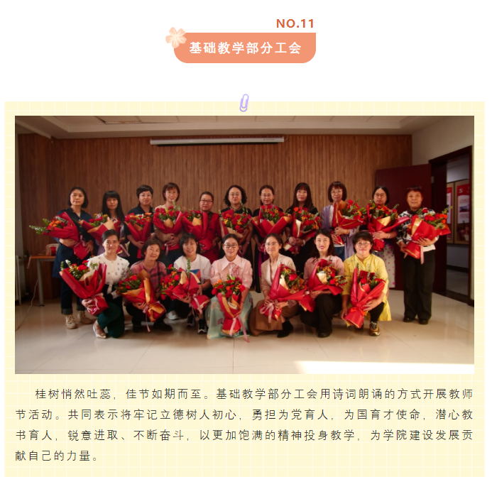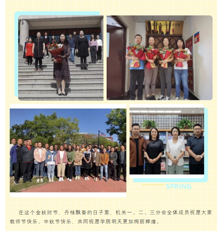 秋菊溢彩,桃李芬芳。第38个教师节与中秋佳节,在2022年的秋日里,不经意间撞了个满怀,“双节”邂逅,芬芳花香伴着浓郁饼香,“香”的就是不一样!欣逢盛世,喜迎学院70华诞,为营造尊师重教的浓厚氛围,激发广大教职工爱岗敬业、爱校如家的热情,引导广大教职工以昂扬向上的精神面貌迎接党的二十大胜利召开。9月9日,在学院领导的高度重视下,学院工会开展“庆祝教师节 鲜花送祝福”活动,花香沁人心脾,传递着满满的问候和祝福。