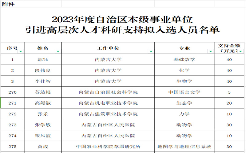 近日,内蒙古自治区人力资源和社会保障厅公示了2023年度自治区本级事业单位引进高层次人才科研支持拟入选人员名单,经单位申报、推荐,专家评审,我院能源与材料工程系高嫚淑老师入选,获批科研支持经费20万元,是自治区入选的两所高职院校教师之一,获支持经费额度排在自治区高职院校首位。此次入选充分体现了自治区对我院引才工作的肯定,进一步彰显我院的科研能力与水平,并对学院下一步引才育才和提升科研水平具有重要的推动和激励作用。公示名单(部分)如下: