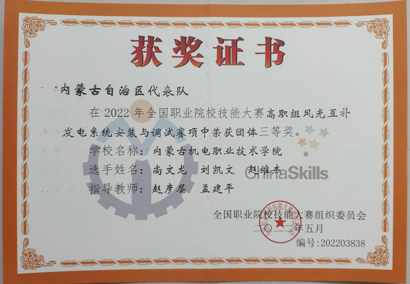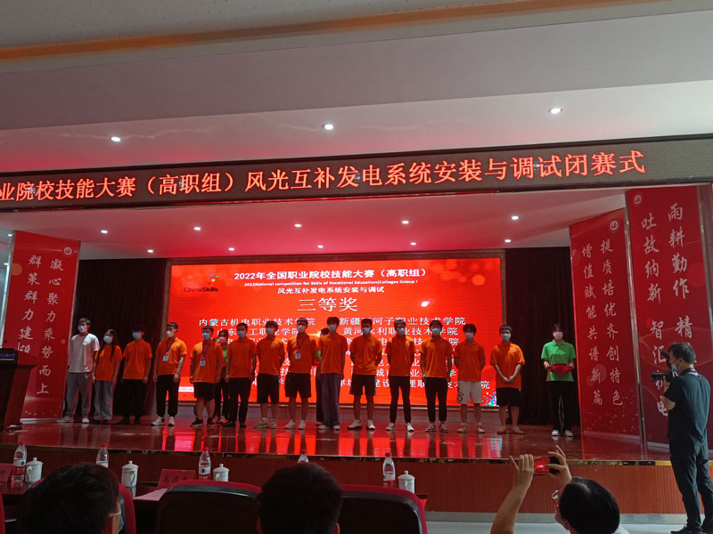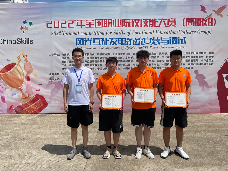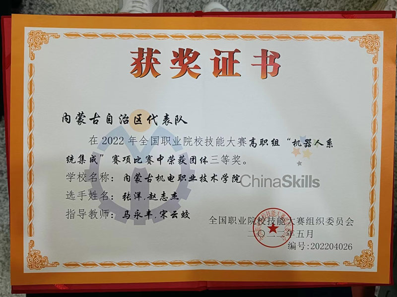 在全国职业院校技能大赛(高职组)“机器人系统集成”、“风光互补发电系统安装与调试”两项赛事中,我院电气工程系学生代表内蒙古自治区参赛,分别荣获全国三等奖。其中学生赵志杰、张洋( 指导教师: 工程技术实训中心宋云蛟、车辆工程系马永丰 )荣获“机器人系统集成”赛项全国三等奖,学生赵维杰、刘凯文、尚文龙( 指导教师: 电气工程系赵彦层、孟建平 )荣获“风光互补发电系统安装与调试”赛项全国三等奖。