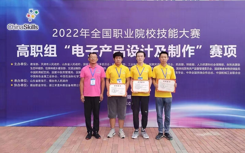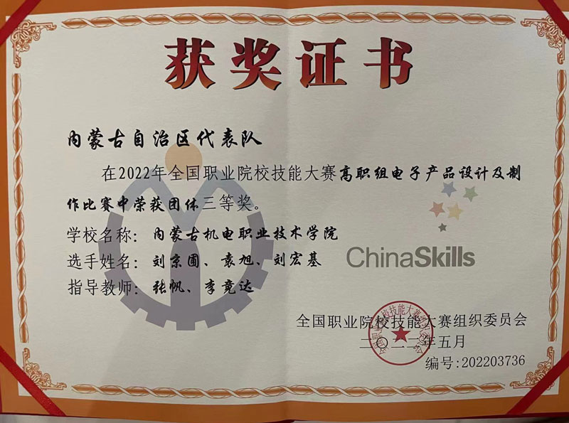 2022年8月21日,全国职业院校技能大赛(高职组)“电子产品设计及制作”赛项在山东烟台开赛,我院电气工程系学生刘京圃、袁旭、刘宏基( 指导教师: 电气工程系张帆、李竟达 )代表内蒙古自治区参赛,荣获全国三等奖。