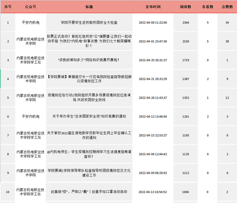 在四月学院微信热文排行榜中,“平安内机电”关于“学院开展学生返校前校园安全大检查”的推文以2344的阅读量、34的点赞量位居榜首,内蒙古机电职业技术学院推送的“投票正式启动!首批红色校史“云”端展播让我们一起动动手指 为我们“内机电”故事点赞 为我们七十载荣耀喝彩 !”推文以2150的阅读数和38的点赞位居第二。内蒙古机电职业技术学院学工处的推文“资助政策知多少”网络知识竞赛开赛啦!”以1719的阅读量位居第三,其他部门推文也以可观数据紧随其后,期待各部门继续拥有热文推送好成绩!