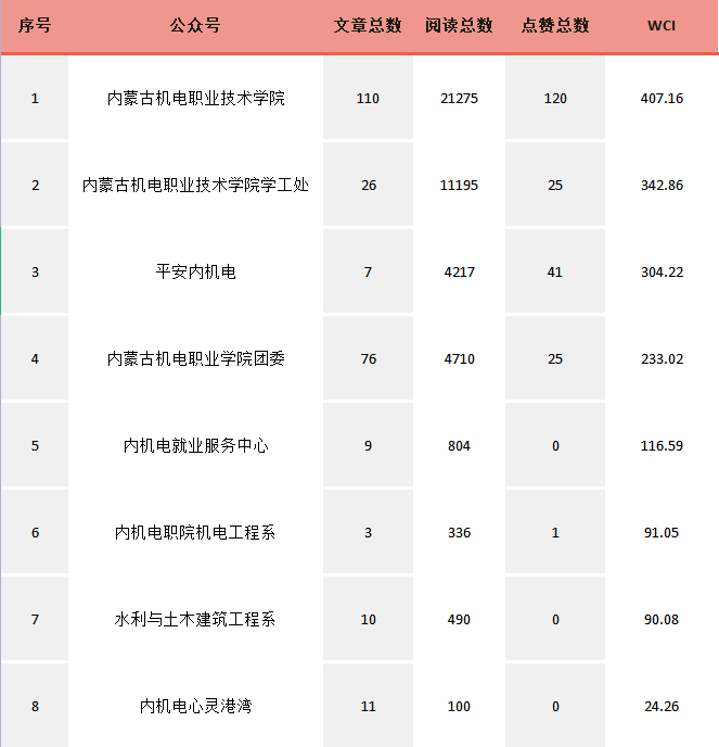 四月份,学院、各部门发文总数268篇,阅读总数43189,点赞总数212。其中内蒙古机电职业技术学院四月发表推文118篇,总阅读量21275,点赞数120,WCI指数407.16,占据排行榜首位,希望五月各部门再接再厉,加油努力!