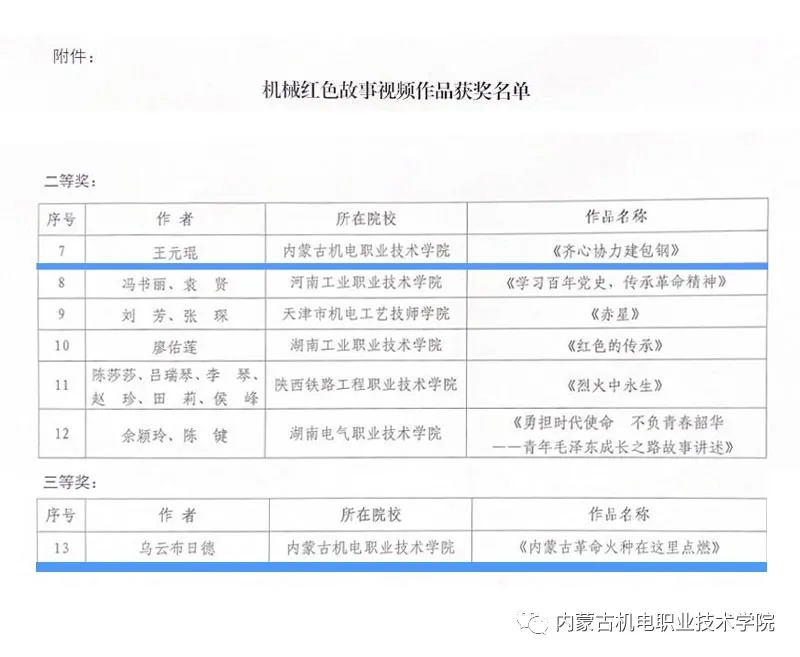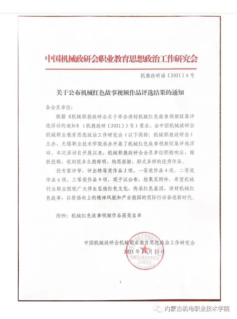 此次评选征集活动,学院党委高度重视,按照《机械职教政研会关于举办讲好机械红色故事视频征集评选活动的通知》要求,党委宣传部具体实施,积极组织教师申报并报送视频作品参与评选,最终我院榜上有名,跻身二、三等奖行列,是自治区唯一获奖高校。至此,致敬建党百年系列新媒体作品—机械行业党史微党课、“颂歌献给党 奋进新时代”师生大联唱、机械红色故事视频,我院选送的5项作品已全部获奖,其中一等奖2项,二等奖2项,三等奖1项。