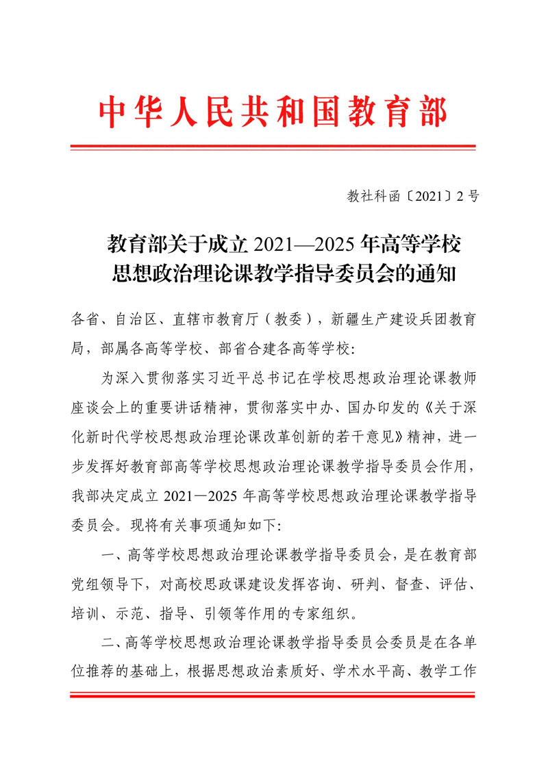 近日,教育部发布《关于成立2021-2025年高等学校思想政治理论课教学指导委员会的通知》。通知指出,为深入贯彻落实习近平总书记在学校思想政治理论课教师座谈会上的重要讲话精神,贯彻落实中办、国办印发的《关于深化新时代学校思想政治理论课改革创新的若干意见》精神,进一步发挥好教育部高等学校思想政治理论课教学指导委员会作用,教育部决定成立2021-2025年高等学校思想政治理论课教学指导委员会。高等学校思想政治理论课教学指导委员会,是在教育部党组领导下,对高校思政课建设发挥咨询、研判、督查、评估、培训、示范、指导、引领等作用的专家组织。本届高等学校思想政治理论课教学指导委员会,设立咨询委员会、教学指导委员会和11个分教学指导委员会。我院马克思主义教研部主任郑云宏当选,被聘为“高职高专思想政治理论课”分教学指导委员会委员,是自治区高职院校唯一入选的分委会委员。