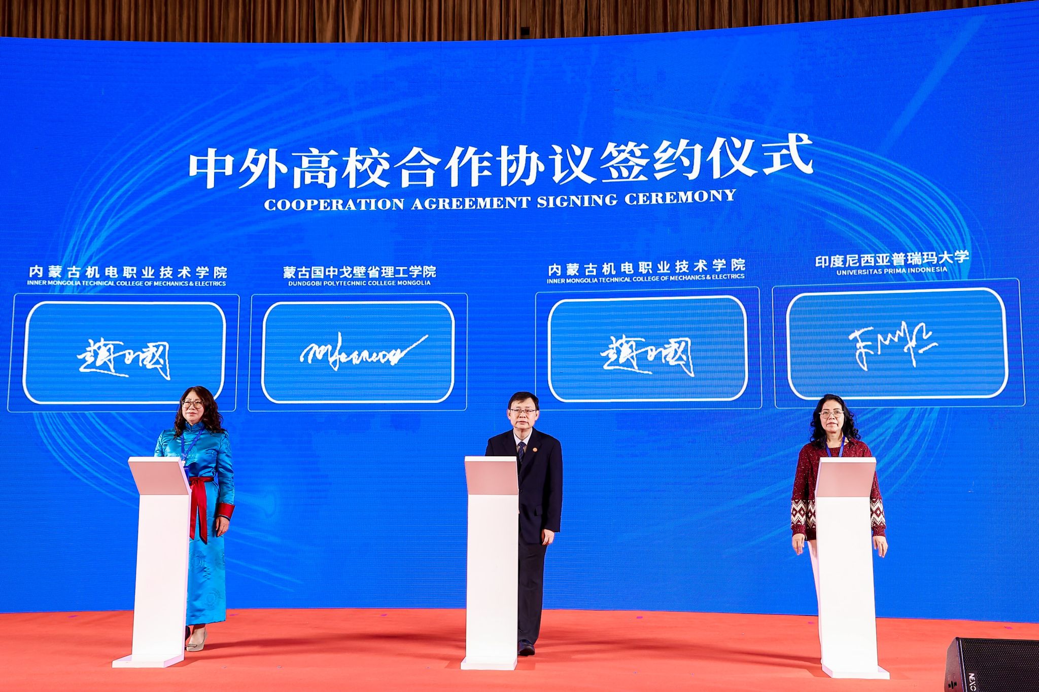 在中外高校合作协议签约仪式上,内蒙古机电职业技术学院与蒙古国CITI大学、蒙古国中戈壁省理工学院等4所院校签署合作协议,有力推动职业教育的国际化发展。