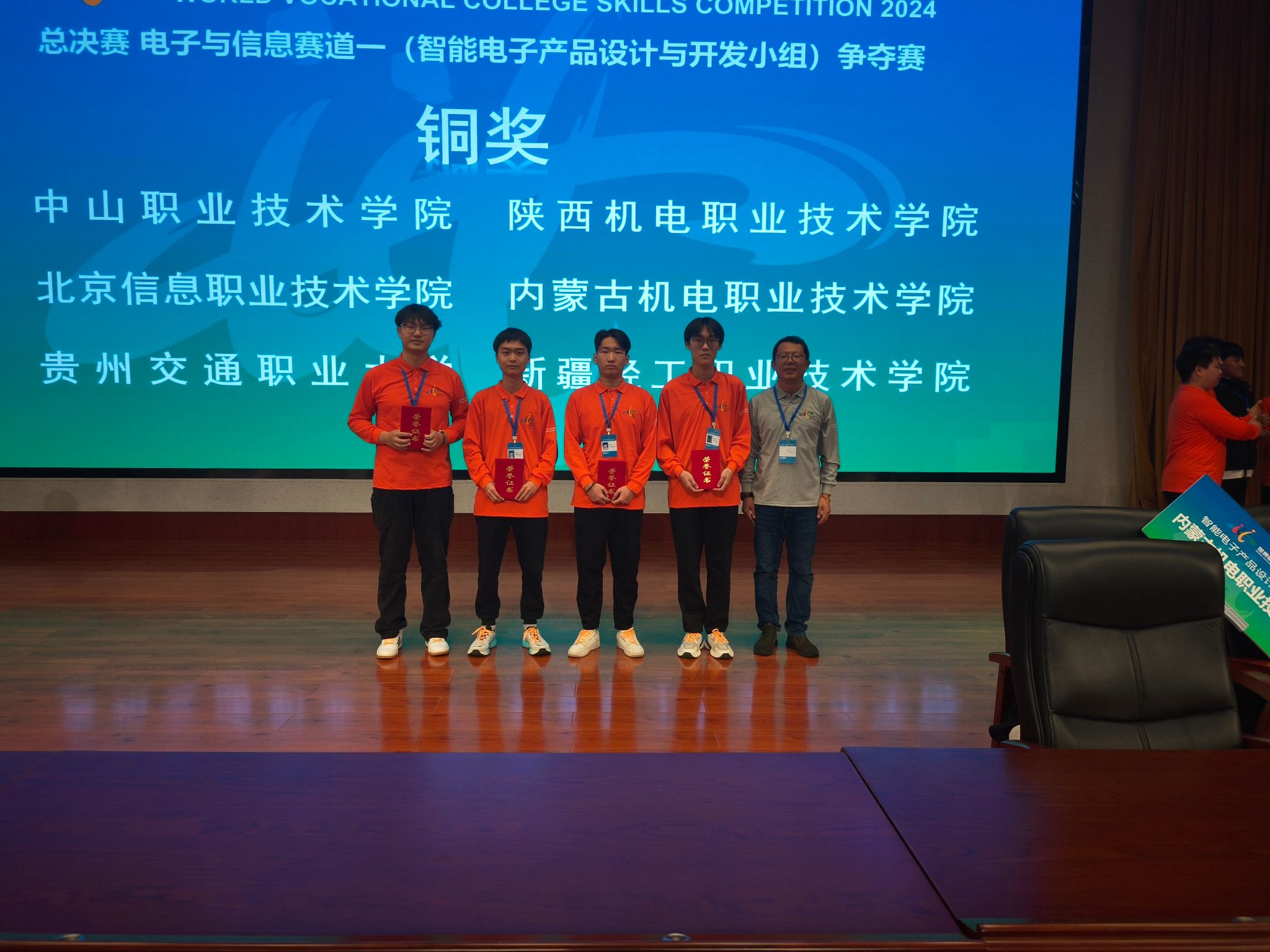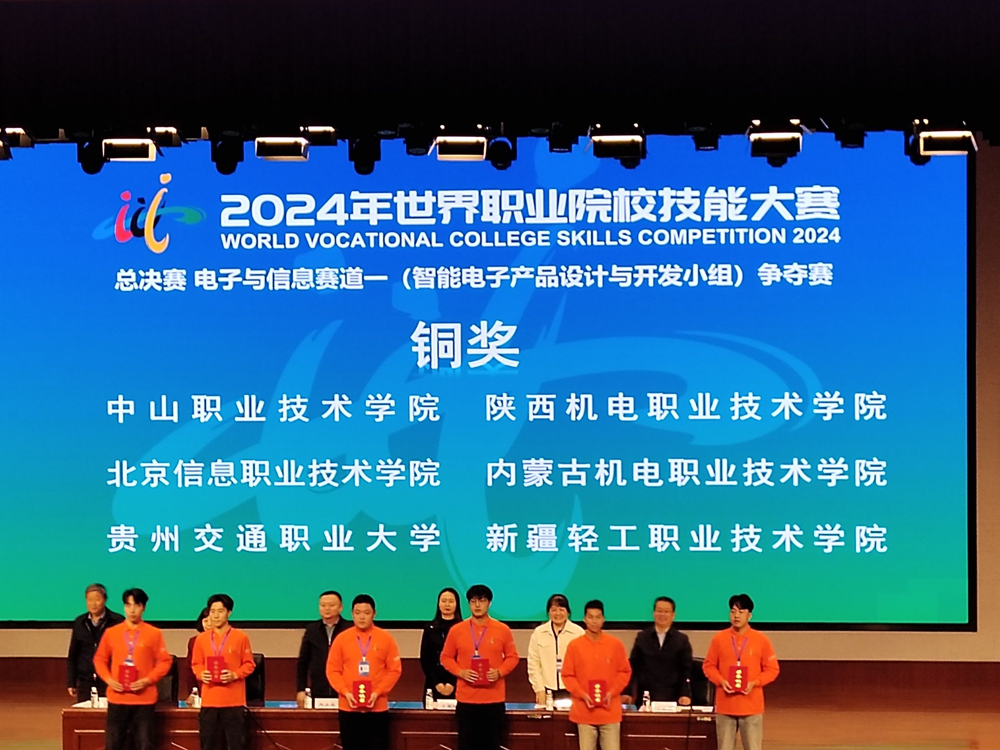 10月28日,2024年世界职业院校技能大赛总决赛争夺赛电子与信息赛道智能电子产品设计与开发小组比赛在烟台职业技术学院举行,来自全国30个省、自治区、直辖市和新疆生产建设兵团61支队伍的233名选手参加比赛。学院电气工程系教师赛恒吉雅、张帆指导的学生张家赫、师竟成、蔺成林、孙钰博荣获铜奖。
