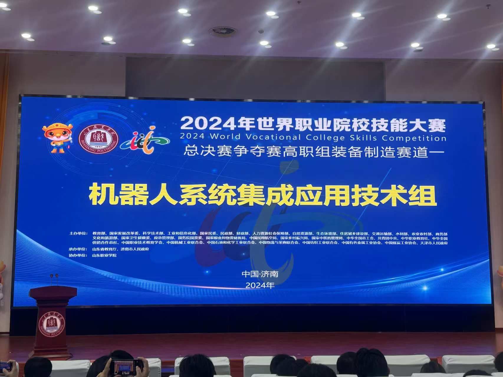 10月28日,2024年世界职业院校技能大赛总决赛争夺赛装备制造赛道机器人系统集成应用技术赛项在山东职业学院举行,来自全国31个省、自治区、直辖市和新疆生产建设兵团的60支高职院校参赛队伍223名学生参加比赛。学院电气工程系教师李春满、张彬老师指导的学生张森皓、刘润泽、吕忻泽和郭桐铭荣获铜奖。