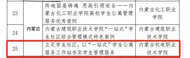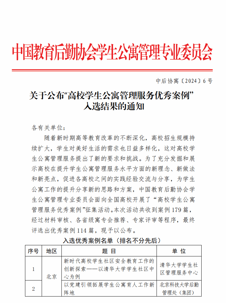近日,中国教育后勤协会学生公寓管理专业委员公布了“高校学生公寓管理服务优秀案例”名单,学院申报的《立足学生社区,以“一站式”学生公寓服务工作站夯实学生管理服务》成功入选优秀案例。