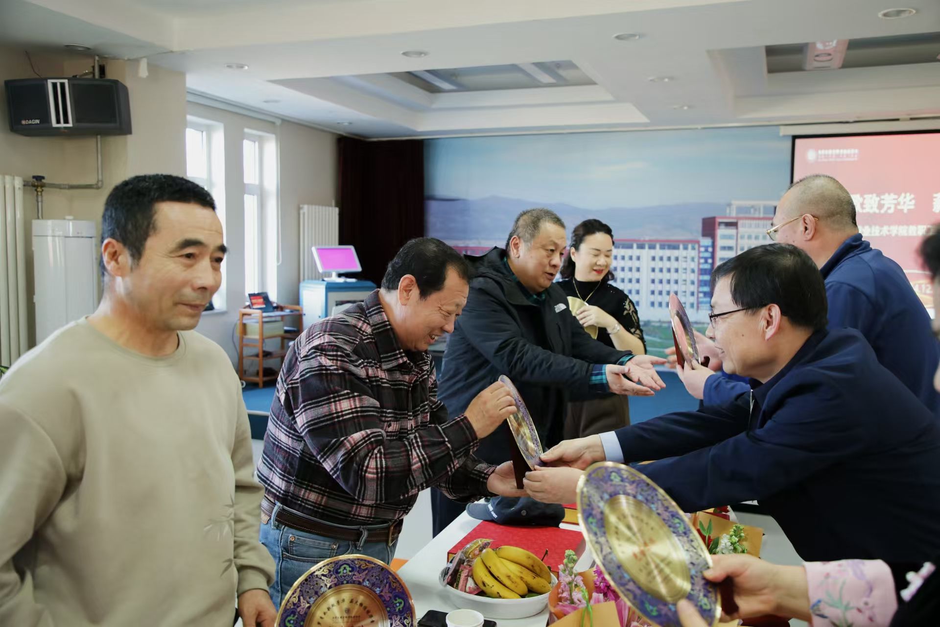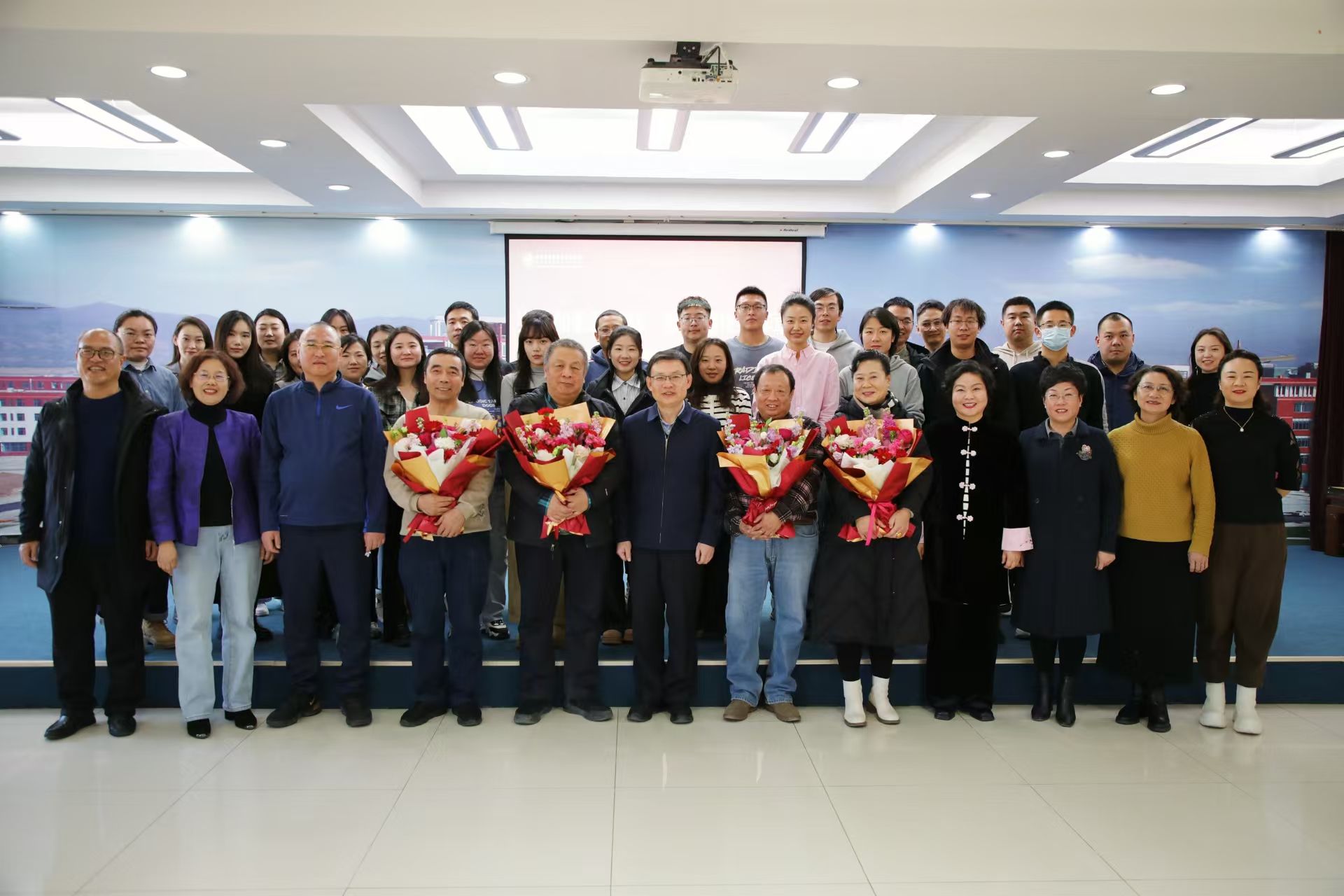 职工之家温情满溢,鲜花簇拥,荣休和新入职教职工齐聚一堂,新老交替间,共叙往昔。学院领导向荣休教职工送上鲜花与纪念奖牌,感谢他们数十载如一日的坚守与奉献。