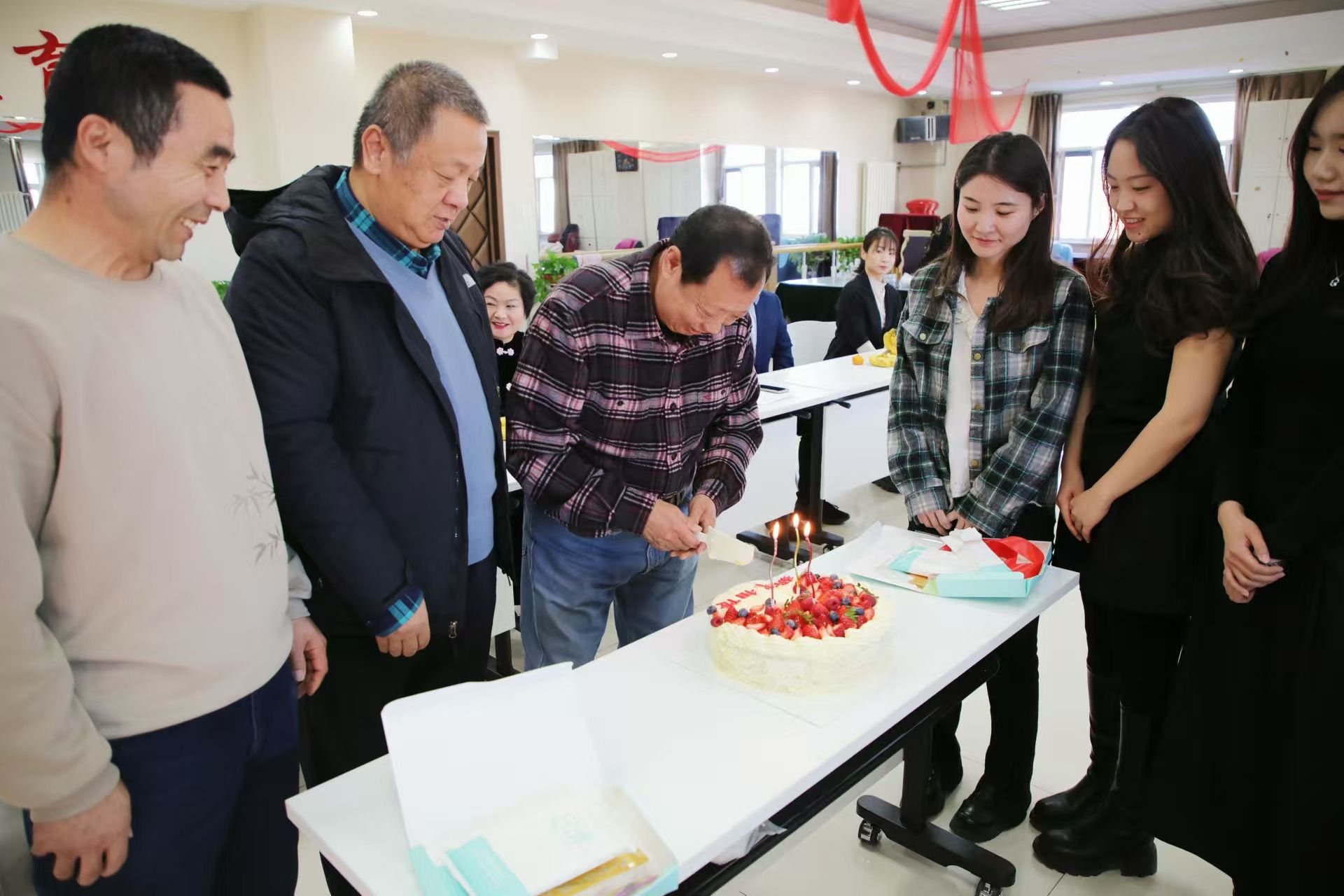 新入职教职工代表为荣休教职工赠送蛋糕和鲜花,送上浓浓祝福,表达惜别之意。他们向前辈虚心求教,交流间尽显传承。