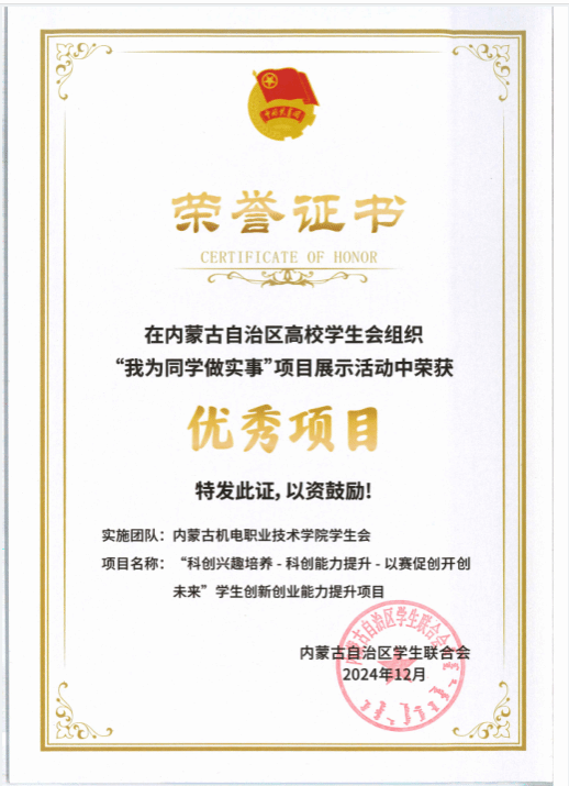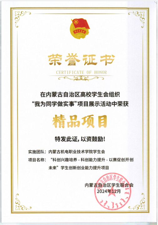 12月6日至7日,由共青团内蒙古自治区委员会指导、内蒙古自治区学联主办、内蒙古自治区高校学生会组织的“我为同学做实事”项目交流展示活动在内蒙古大学举行。通过集中展示、项目答辩等环节,我院学生会推报的《“科创兴趣培养—科创能力提升—以赛促创开创未来”学生创新创业能力提升项目》脱颖而出,获评“精品项目”和“优秀项目”。