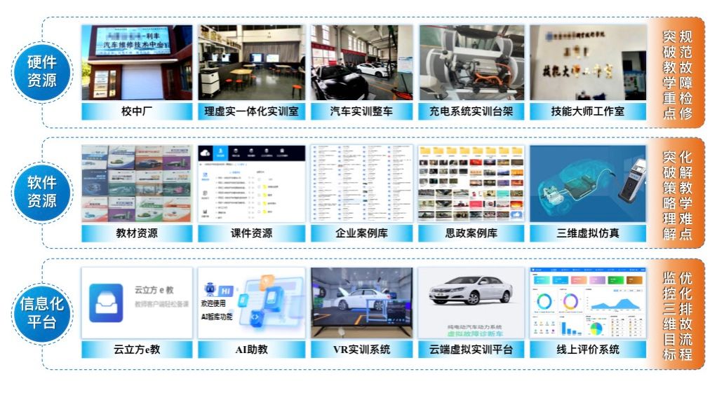 利用现代信息技术,校企共建共享VR实训系统、云立方虚拟仿真实训平台、云立方e教平台、AI 助教等虚拟教学资源;共建共享实训整车、实训台架、校中厂、理虚实一体化实训室、技能大师工作室等硬件资源。虚实结合资源(见图1)为实施“虚练实修”教学提供有力保障。