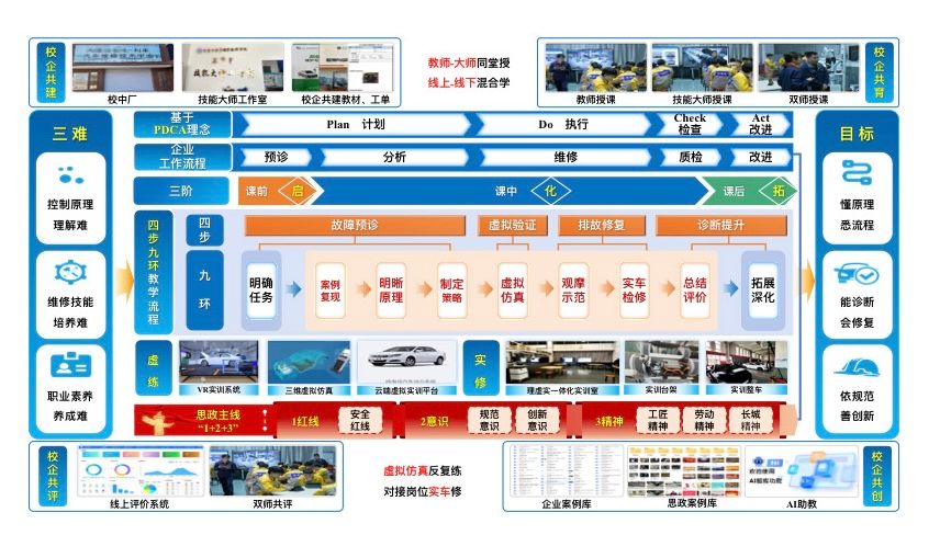 汽车是新质生产力的典型代表,当前,汽车产业端聚焦汽车革新技术,实施数智化汽车制造,催生汽车后服务企业端急需一批“懂技术原理、能智能诊断、会完美修复”机电维修现场工程师。汽车类专业核心课程存在“控制原理理解难、维修技能培养难、职业素养养成难”三难问题,因此,依托“校中厂”和长城汽车产业学院,融合长城汽车真岗位、真标准、真项目和真流程的“四真情境”,设置长城订单班,实施“校企双元、虚练实修”教学策略,该策略深度融合学校与企业两种教育资源,通过“虚拟仿真反复练、对接岗位实车修”,实现培养“新质人才”——汽车机电维修现场工程师“新质素养+创新素养”的双提升。