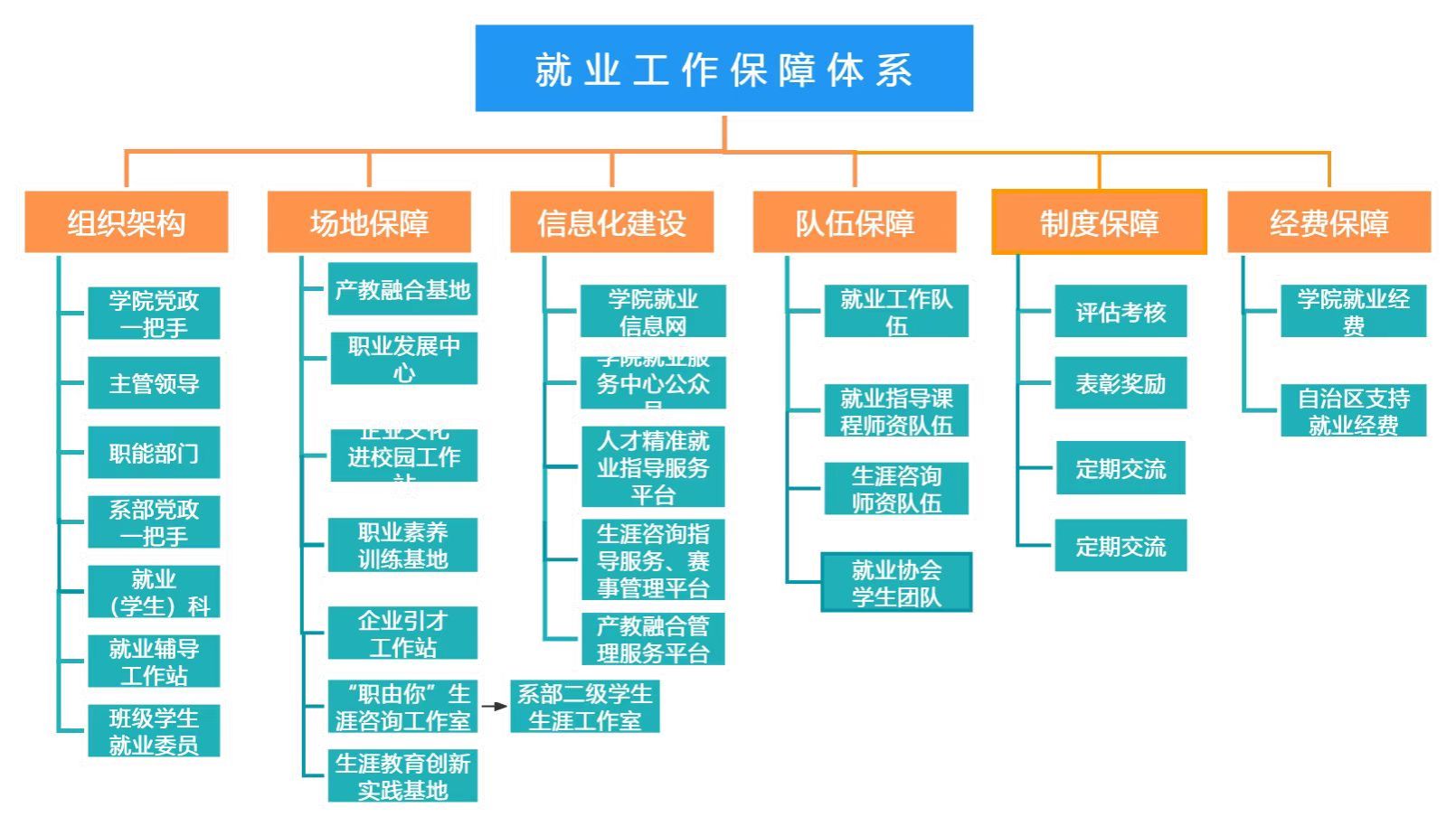 学院下发了“关于调整毕业生就业工作领导小组”“加强建设就业指导师资队伍”“生涯发展咨询师管理办法”等通知文件,成立了以党委书记、院长为组长的就业工作领导小组,组建了专业教师、专职就业工作人员、辅导员等全员参与的校内稳定的就业指导师资队伍,以及由自治区内各高校生涯教育专职工作人员、企业人力资源专家与技术技能专家、生涯教育机构专业培训师与咨询师等多元结构组成的生涯发展教育师资库,按照“定向、定位、定发展”的终身教育发展理念,构建“岗课赛证”一体化的专就专创融合课程体系。校校共建就业指导与生涯规划两个虚拟教研室,校企共建职业发展中心,成立职业发展领导小组。从加强顶层推动、加大资源整合等多维角度加强就业指导工作,形成了“党委领导、就业育人、生涯发展教育”三位一体的育人新格局。
