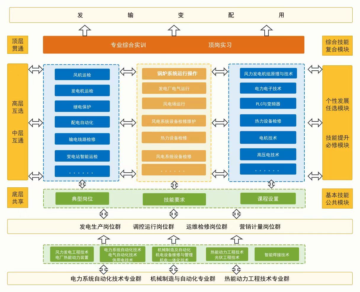紧扣“立德树人”这条主线,校企共建“电力”“霍林河能源装备”等8个产业学院,成立现代学徒制试点班、工匠班等,创新岗位培养、岗位实习、岗位成才“一岗三阶”产教融合育人模式(图1)。实施“双导师”培养,建设“学校课堂”“企业课堂”互联互通的职业技能提升教学模式;课程与岗位网格对接,共建适应岗位需要与产业发展需求的模块化课程体系,多元主体协同育人,为提升学生技术技能和稳就业奠定了坚实的基础。例如电力产业学院 “发-输-变-配-用”模块化课程体系如图2所示。