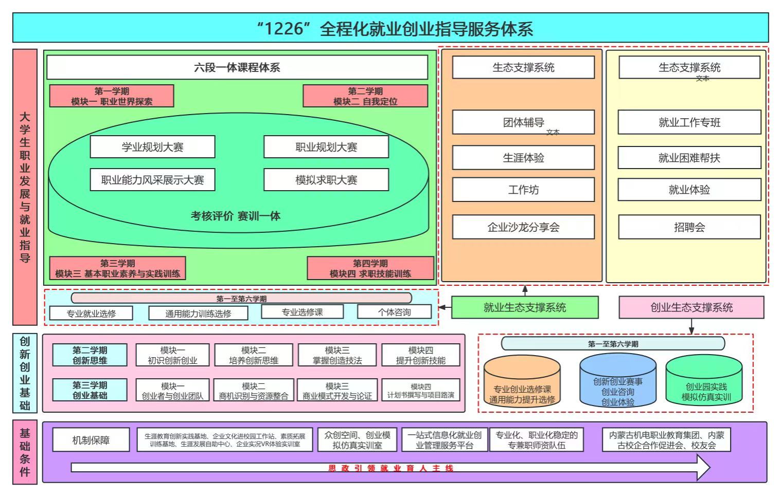 建设校企合作交流、教学运行管理、生涯咨询、赛事管理一站式就业创业信息化管理服务平台,建设校省部三级信息互通的24365大学生就业服务平台。围绕北疆民族区域特色以及学生生源特点,以铸牢中华民族共同体意识为引领,就业育人为主线,就业创业指导课程为依托,构建“一条育人主线、两门必修课程、两个生态支撑系统、六阶段实施”的“1226”全程化就业创业指导服务体系。开展新生就业前置调研,制定分类别、分层次、分阶段的全程化就业指导实施方案,成立“就业工作专班”,生涯咨询师资队伍成员实施包联制,针对困难群体实施一对一帮扶。有效利用2门就业、创业指导课程必修属性,搭建就业指导生态支撑系统与创业指导生态支撑系统(图4)。