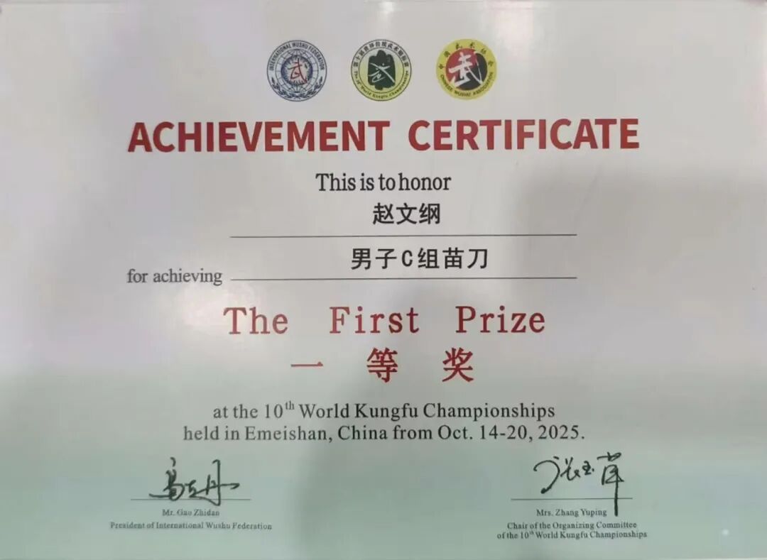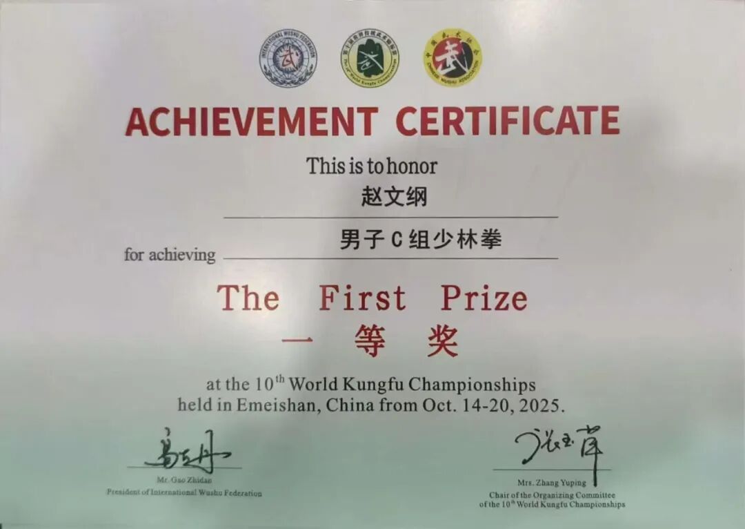 近日,素有“武术界奥运会”之称的第十届世界传统武术锦标赛在四川省峨眉山市圆满落幕。在这场全球武术盛会中,我院学子赵文纲与来自54个国家及地区的5000余名高手同台竞技,表现卓越,最终凭借精湛技艺与稳定发挥,一举斩获男子C组少林拳与苗刀项目两项一等奖!