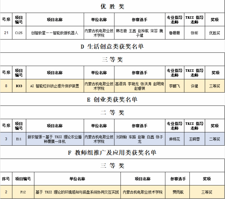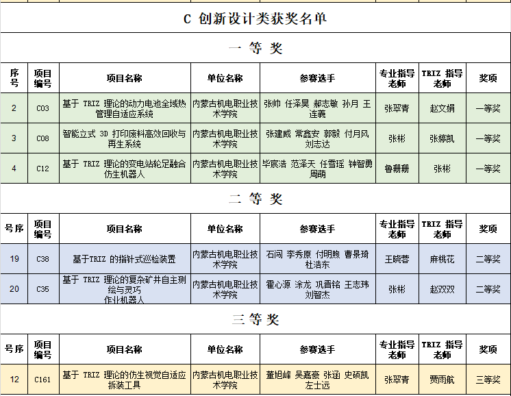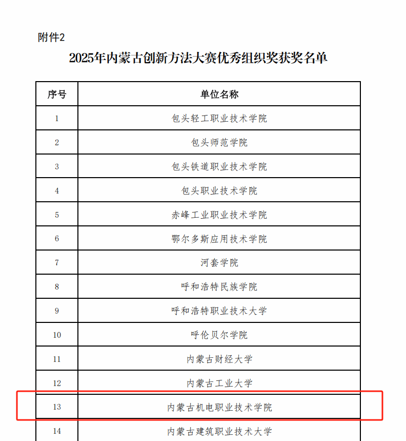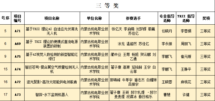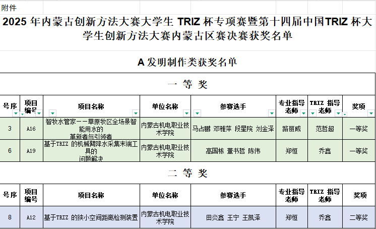 近日,2025年内蒙古创新方法大赛大学生TRIZ杯专项赛暨第十四届中国TRIZ杯大学生创新方法大赛获奖名单正式公布。学院参赛团队表现优异,一举斩获一等奖5项、二等奖4项、三等奖10项、优胜奖5项,学院获评优秀组织奖。