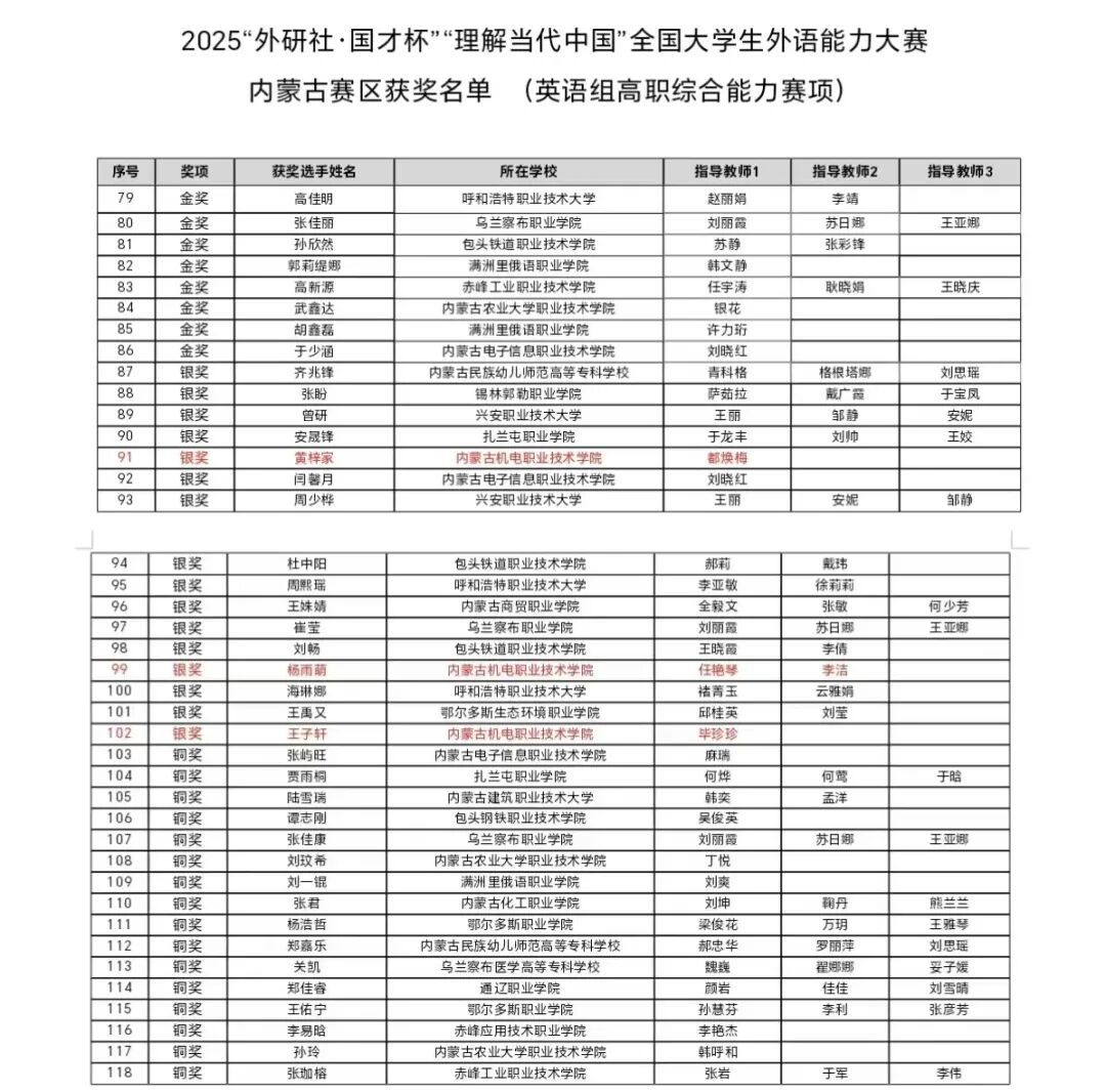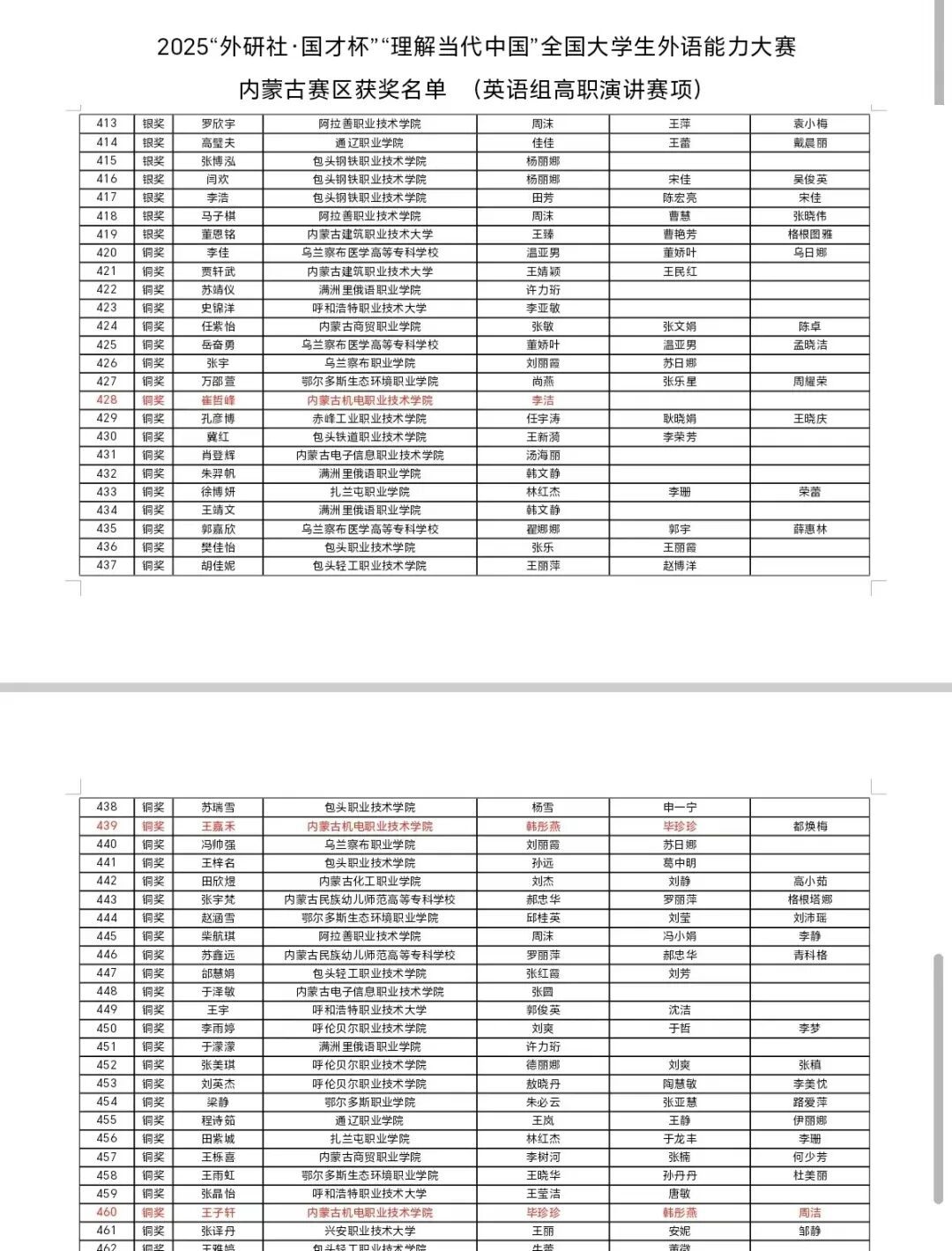 日前,自治区教育厅主办的2025“外研社·国才杯”“理解当代中国”全国大学生外语能力大赛内蒙古赛区选拔赛圆满落幕。经过激烈角逐,我院学生黄梓家、杨雨萌、王子轩、崔哲峰、王嘉禾表现卓越,共获英语组高职综合能力赛项银奖3项、英语组高职演讲赛项铜奖3项。