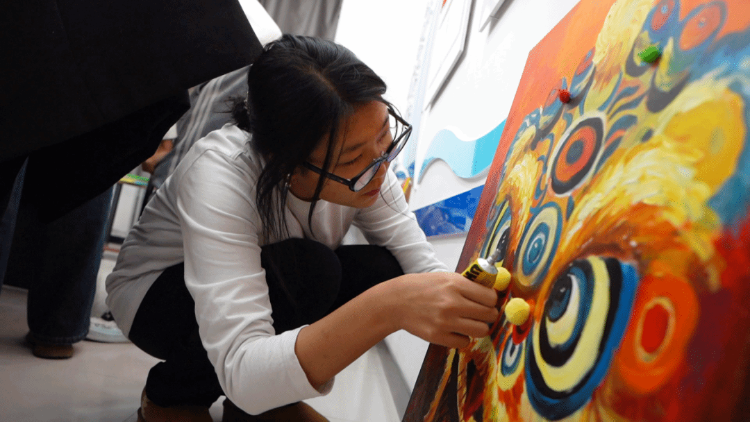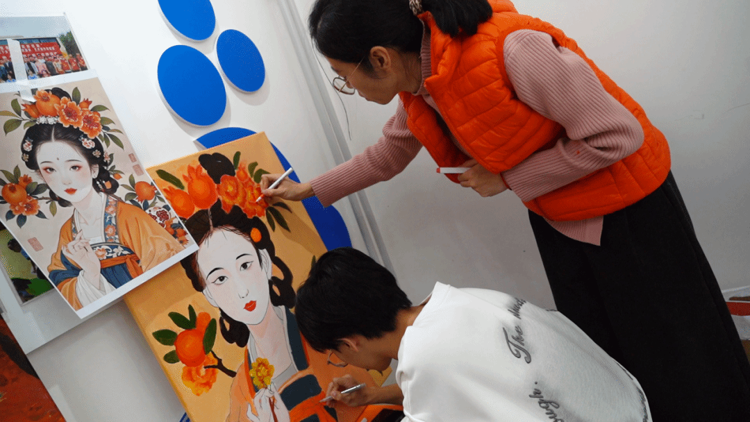 现场创作气氛热烈,暖意融融。在校外专业导师郭璇、赵路平的悉心指导下,同学们手持画笔尽情发挥。他们以明快鲜活的丙烯色彩,勾勒出层次丰富的画面:有的通过强烈的明暗对比与夸张笔触,为传统意象注入现代潮流感;有的则将青花瓷纹、榫卯结构等经典元素巧妙融入构图,凭借大胆的想象与绚丽的色彩,展现出别具一格的国风韵味。大家以青春视角,在方寸画布上再现非遗文化的深厚底蕴,使中华优秀传统文化在校园中焕发出新的生机与活力。