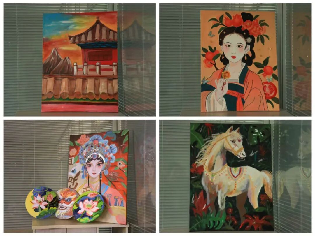 经过一周的精心创作,十余幅融合非遗底蕴与青春气息的丙烯画作品终于完成。这些作品既呈现了传统与现代的美学对话,也展现了青年学子的奇思妙想,让我们一同欣赏这些充满创意的作品!