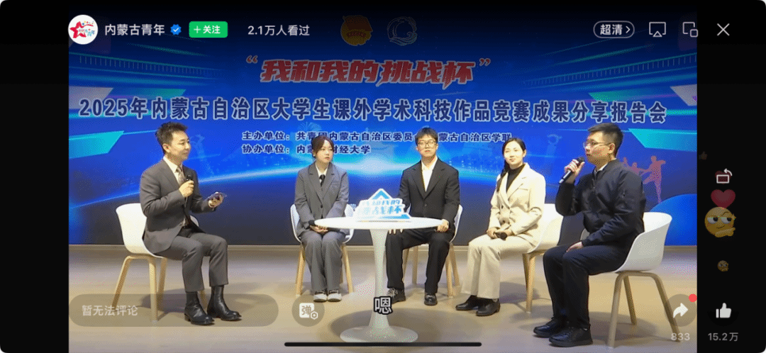 11月26日,内蒙古自治区团委、内蒙古自治区学联共同主办的“我和我的挑战杯”——“青春筑梦 科创报国”主题分享交流会在内蒙古财经大学成功举办。本次活动涵盖“青春筑梦 科创报国”科学家精神分享、“我和我的挑战杯”科创故事分享、“成长分享・心路历程”访谈三大环节。