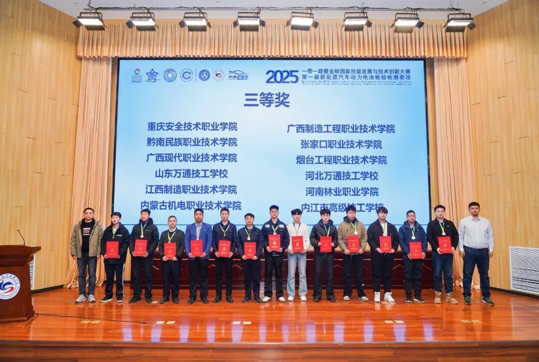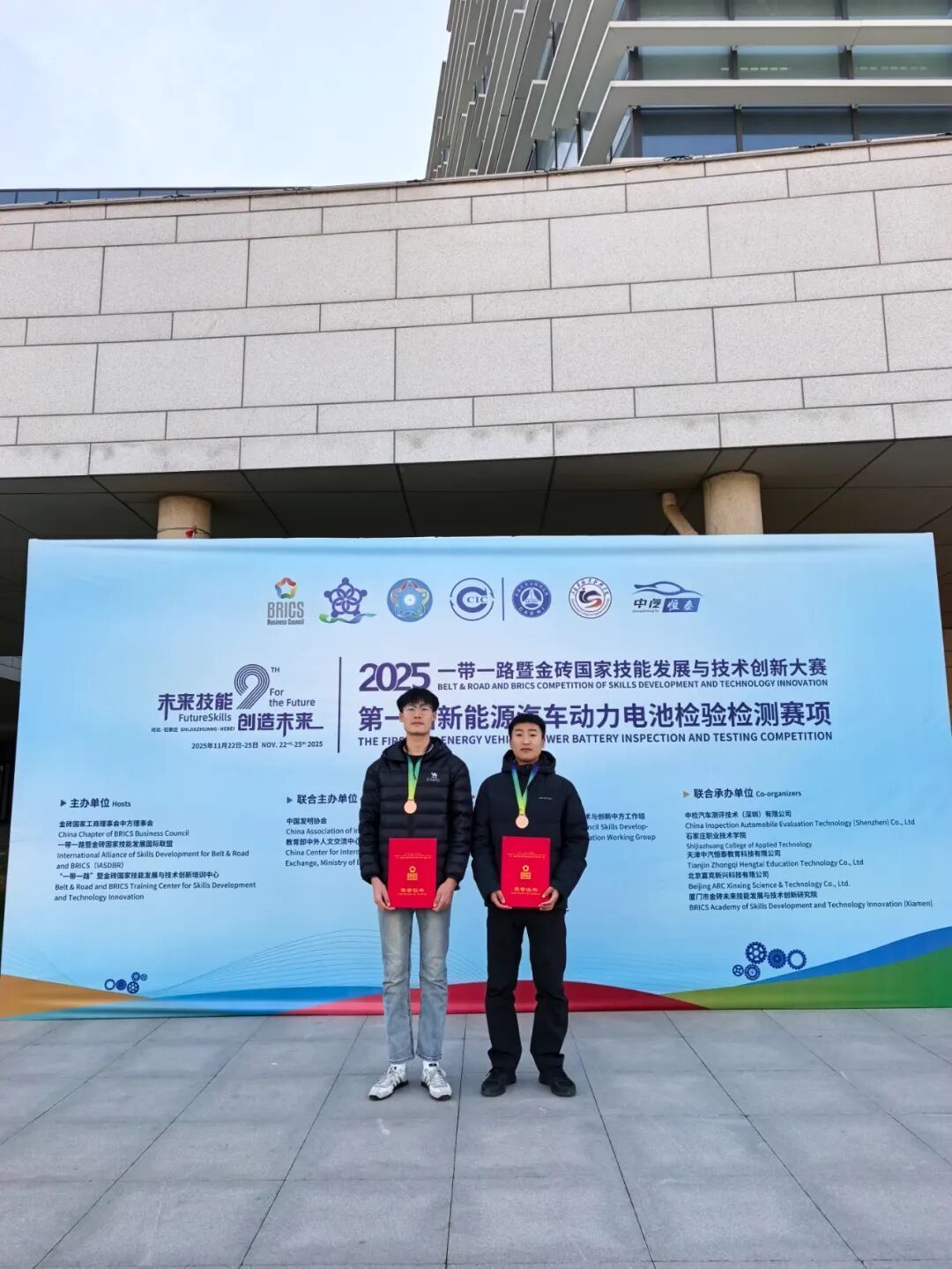 11月22日至26日,2025年一带一路暨金砖国家技能发展与技术创新大赛第一届新能源汽车动力电池检验检测赛项全国总决赛圆满落幕。经过激烈角逐,我院车辆工程系学子史硕凯、田浩珺荣获全国三等奖。