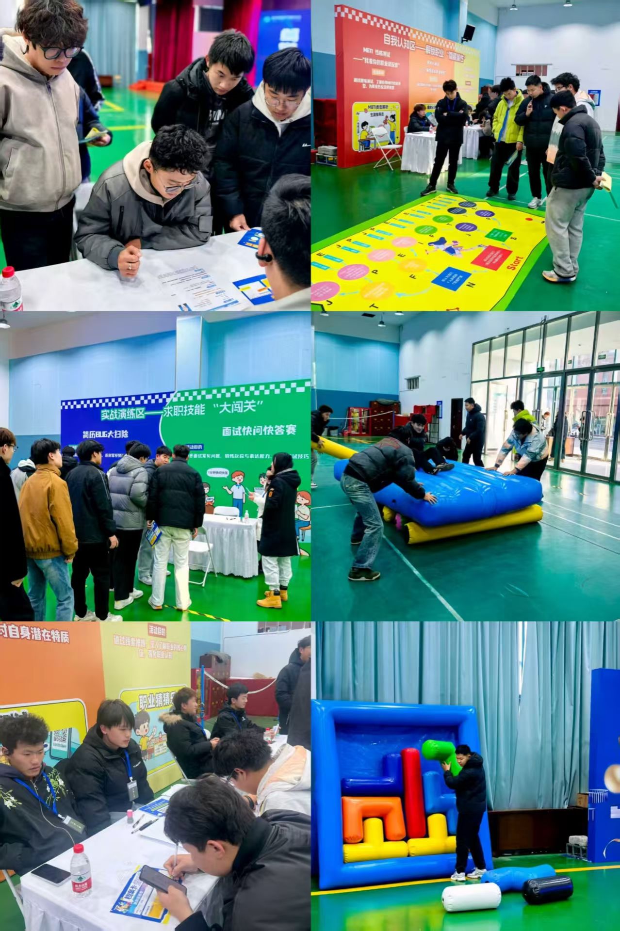 活动现场,在实战演练模块中,学生通过“简历BUG大扫除”扮演简历审查官,参与“面试快问快答赛”,系统提升简历撰写与甄别能力,锻炼应变表达与逻辑思维;在自我认知模块中,学生通过“MBTI性格测试”“房树人”绘画及“职业猜猜猜”互动游戏,深入探索个人特质与职业倾向,拓宽职业视野;在团队协作模块中,学生通过共同参与“车轮滚滚”“俄罗斯方块”巨型气模协作任务,在实践中理解职场中的分工协作、资源整合与高效沟通,切身感受团队协同的价值与力量。