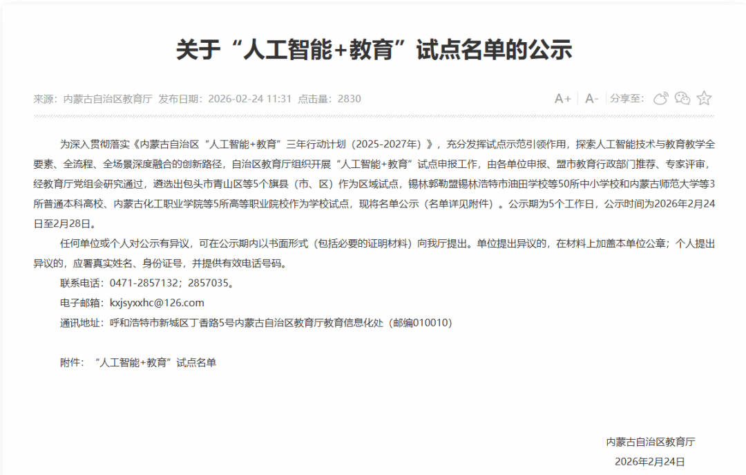 近日,内蒙古自治区教育厅公示了“人工智能+教育”试点名单,我院成功入选高等职业院校试点单位。