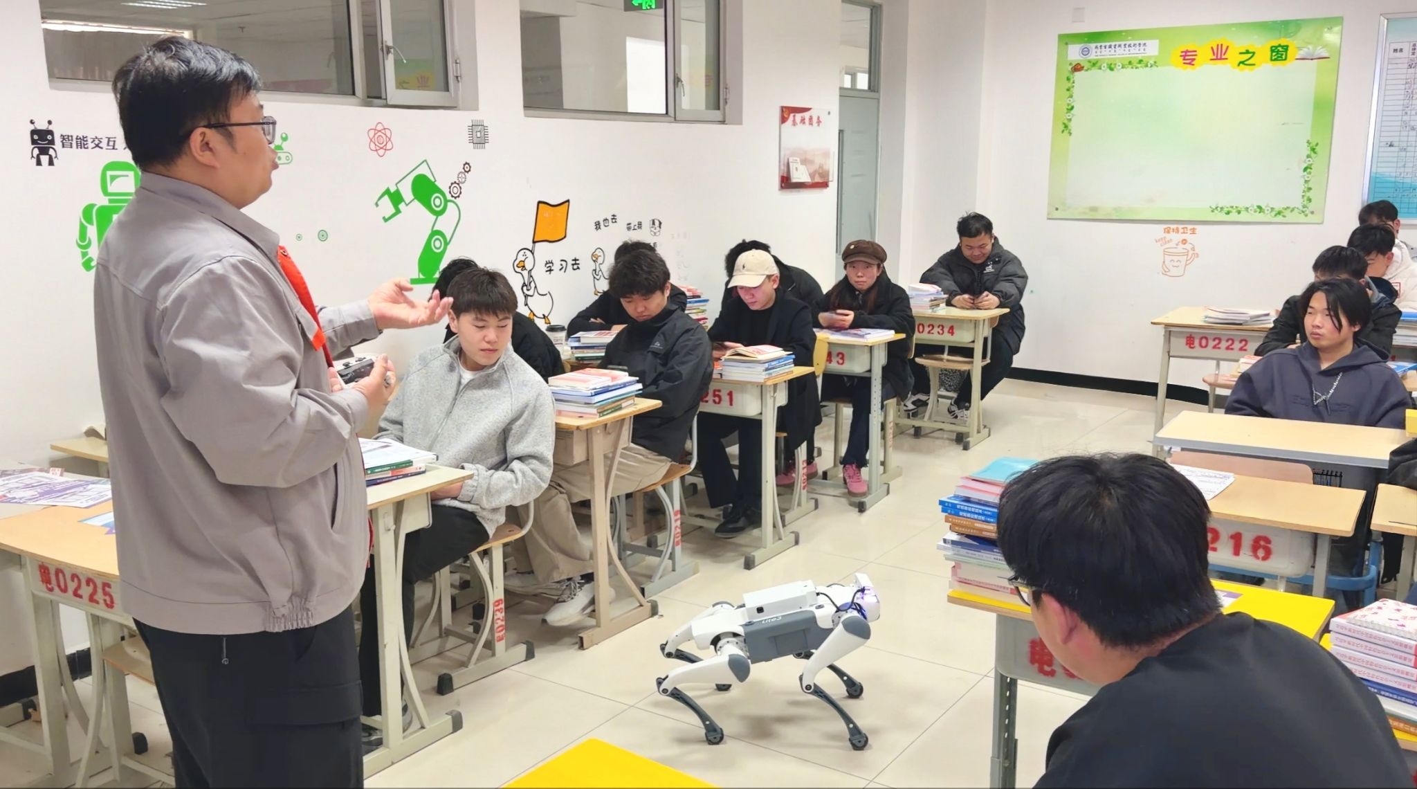 近日,在学院电子信息技术2401班的《工业机器人应用技术》课堂上,一位特别的“新助教”——云深处四足机器人,与授课教师联手,为同学们带来了一堂生动又前沿的专业课。