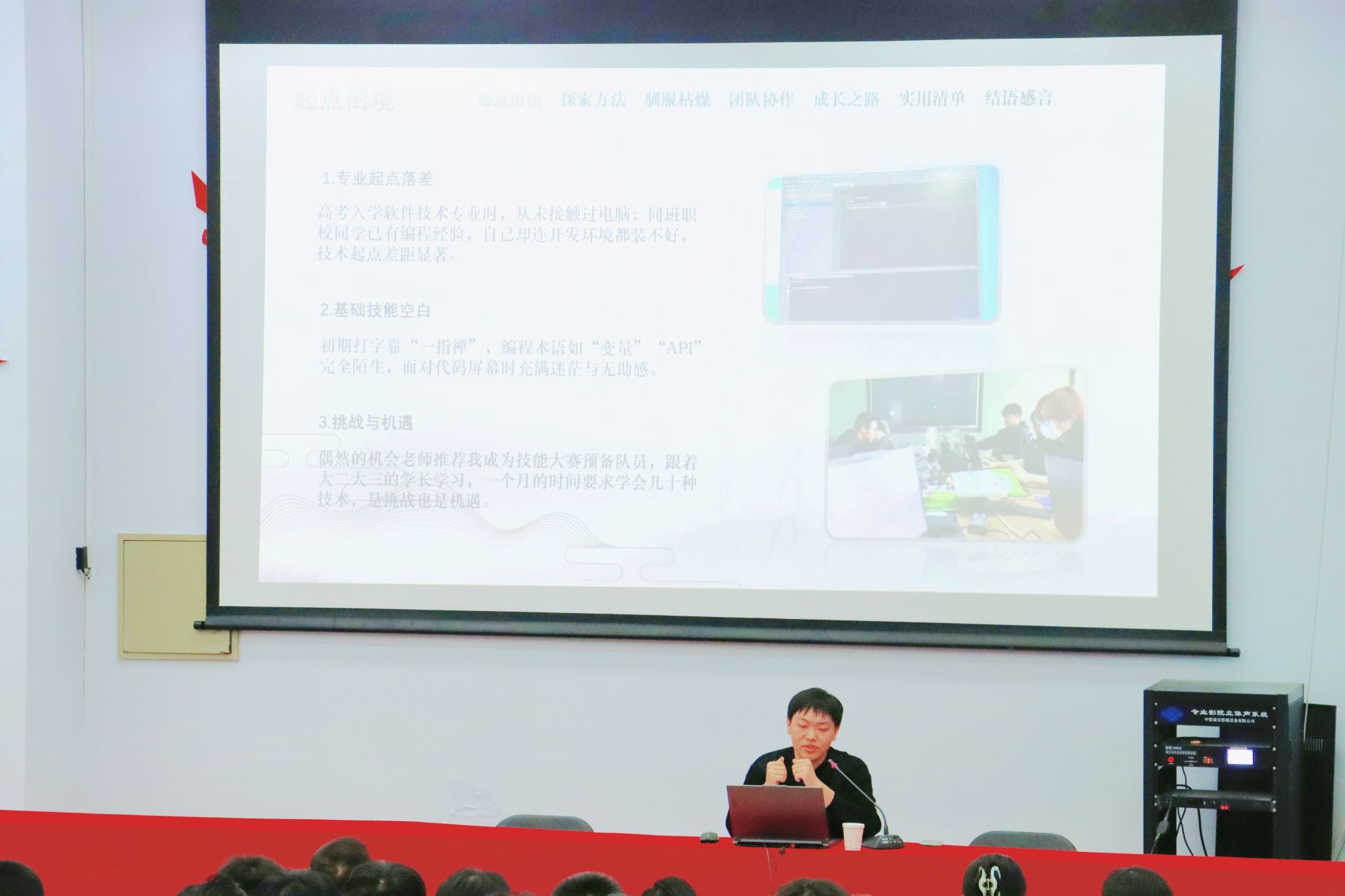 会上,在国家级技能大赛中获奖的软件技术2301班赵鑫宇分享了参赛历程与感悟,表达了对指导教师和团队的感恩。他讲到严谨诚信是技术人员的根本品质,大赛经历不仅提升了专业技能,更培育了追求卓越的工匠精神。云计算技术应用2201班王嘉乐分享了从专科到本科的奋进历程,鼓励同学们将励志目标转化为具体行动。